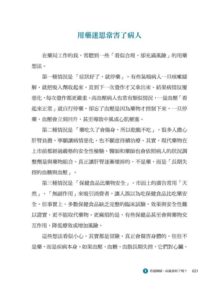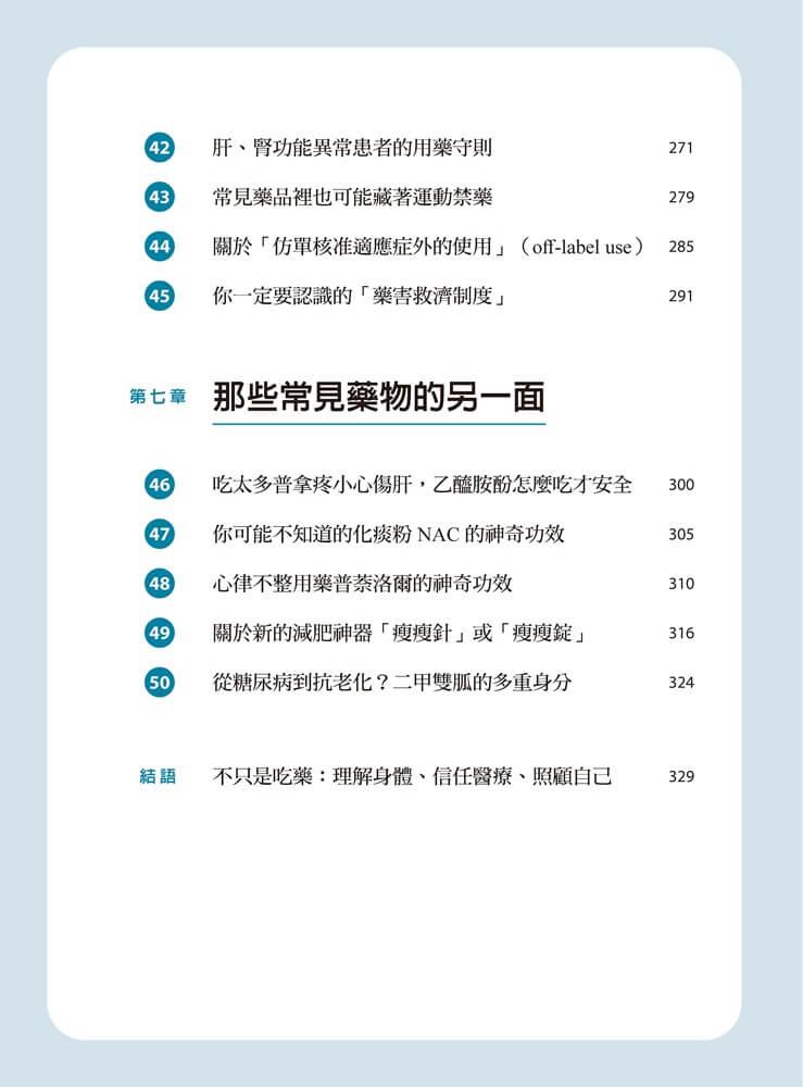 不論你是醫療人員、病人、照顧者、家中的長輩、父母,或是對健康有興趣的社會大眾,都能在這本書中找到真正重要、實用且能立即改善生活的用藥知識。希望本書能幫助你更理解身體、信任醫療, 也學會在每天的選擇中,自我守護健康。