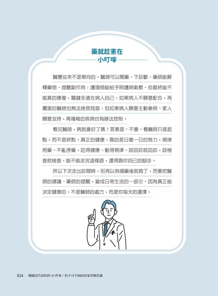 這本《藥師沒告訴你的50 件事:你不可不知的居家用藥常識》,更充分展現了他「把複雜的醫療知識,轉化為人人都看得懂的健康常識」的能力。書中不僅條理分明,也充滿臨床案例與生活觀察,讓讀者在輕鬆閱讀中,掌握真正重要的用藥安全觀念。