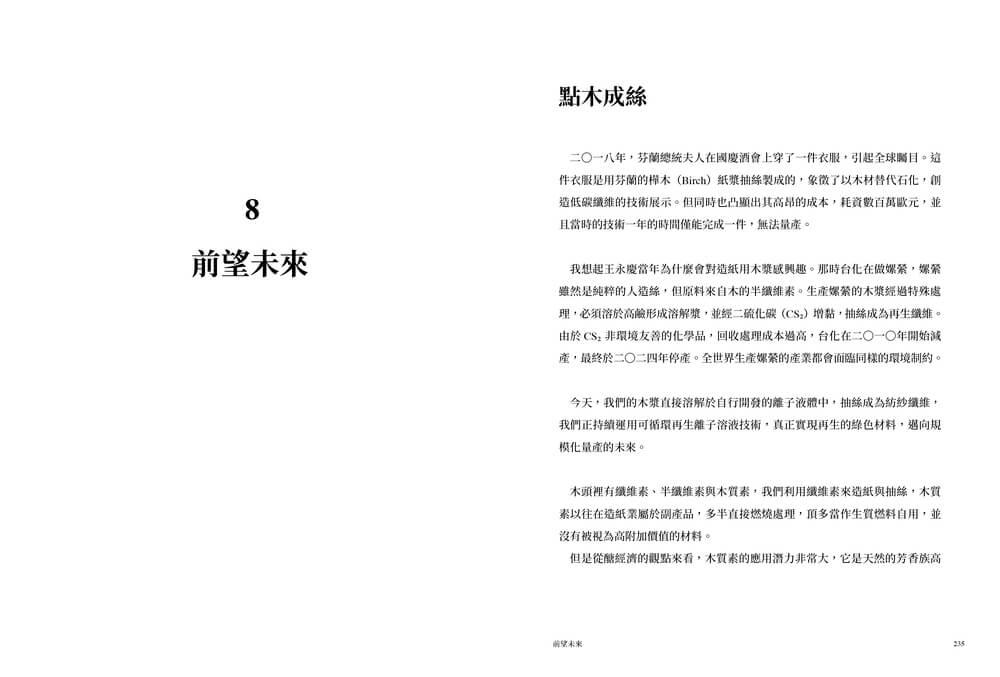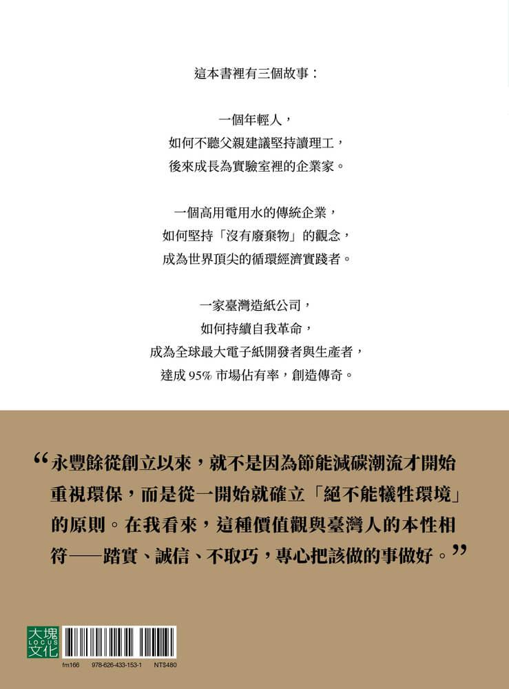 書中記載了他如何以「實驗精神」開疆拓土——從親手設計抄紙機台到預見電子紙未來的精準嗅覺,並將關愛土地的情懷,化為建立全循環產能的堅持。他也因而發展出「醣經濟」理論。