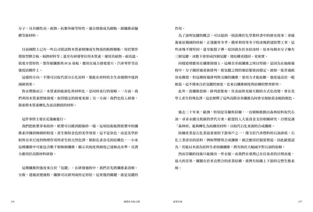 最後,本書最後還有一章「前望未來」,透過何壽川個人和永豐餘正在研發的最尖端科技視野,展望人類生活,從衣著、住屋、交通工具的各種新變化的可能,以及臺灣企業可以如何在連結草根中,參與這些新的機會。