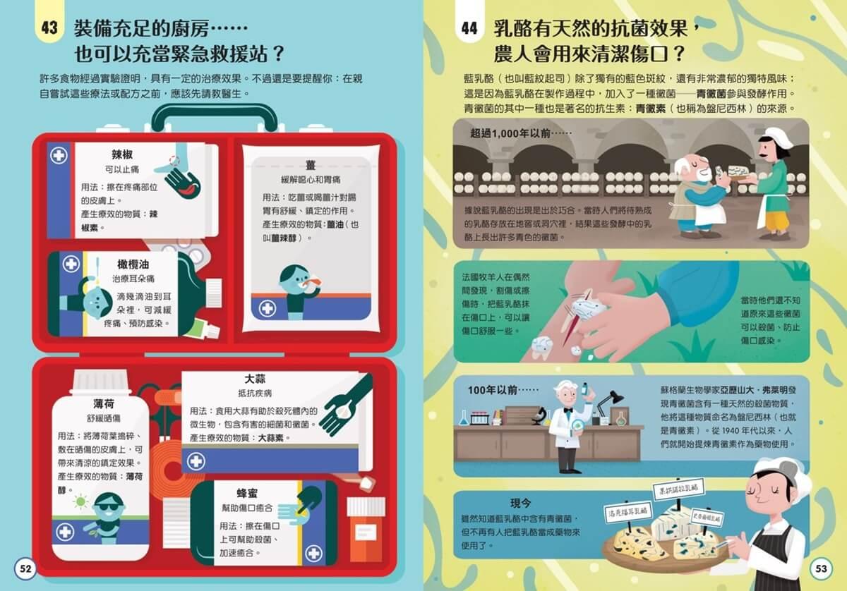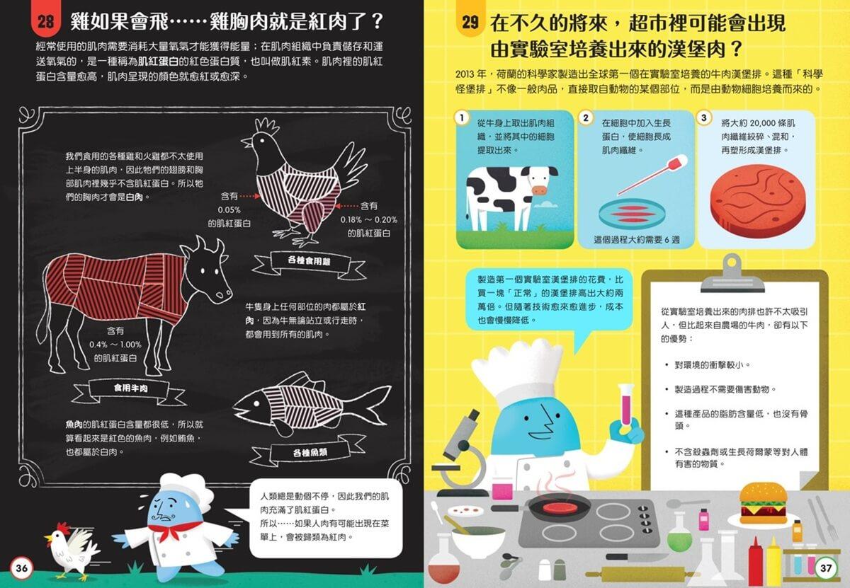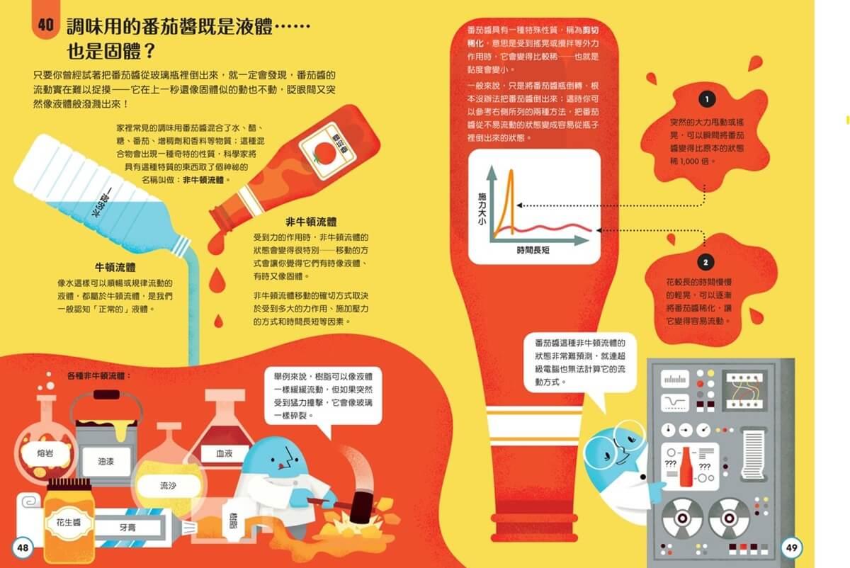 你可以從任何一頁開始,瞭解各種最新奇的食物酷知識,例如:酸甜的番茄醬是液體也是固體?乳酪有天然的抗菌效果?不用麵粉和蛋也可以做蛋糕?蜂蜜可以永久保存、不會腐壞?乳牛想睡時擠的奶,你喝了也會昏昏欲睡?