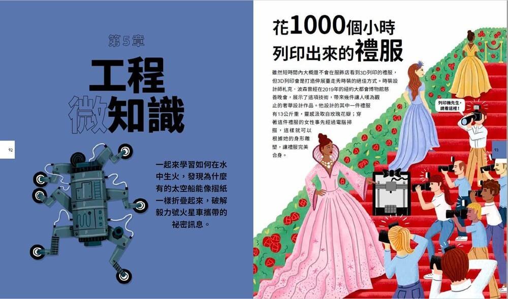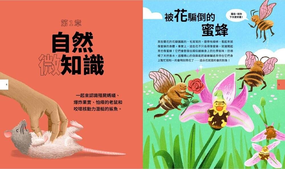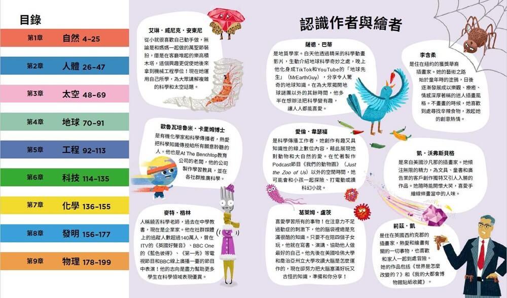全書分成工程、太空、生物等章節,由一群專家深入挖掘各個角落,挑選出最酷的科學知識。每頁都搭配令人捧腹的插畫,帶領孩子認識被真菌控制的殭屍螞蟻,了解太空人為什麼把排泄物留在月球上,還會讀到有些海灘的白沙竟然是魚的便便。他們也會學到一些看似沒有用的知識,例如你頭上所有的頭髮加起來,理論上可以承受住兩頭大象的重量。
