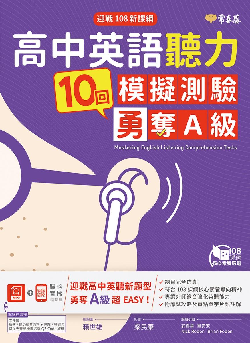 為回應各校教學與學生迫切的需求,本人帶領常春藤中、外編輯團隊再次根據大考中心最新頒布的高中英聽試題示例及參考歷年高中聽力測驗考題,精心編纂《迎戰 108 新課綱:高中英語聽力10回模擬測驗勇奪A級》一書,每回試題均含「圖片聽解」、「對答」、「簡短對話」、「短文聽解」與「長篇聽解」題型。