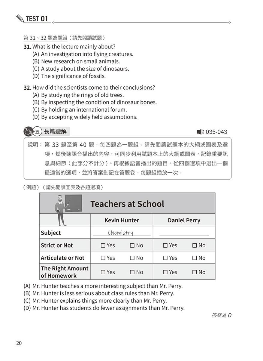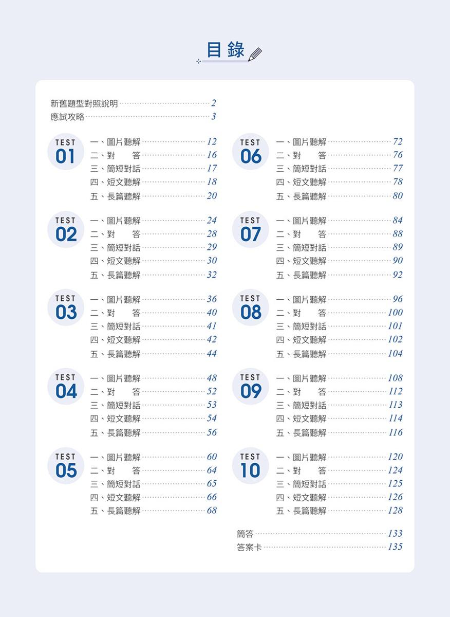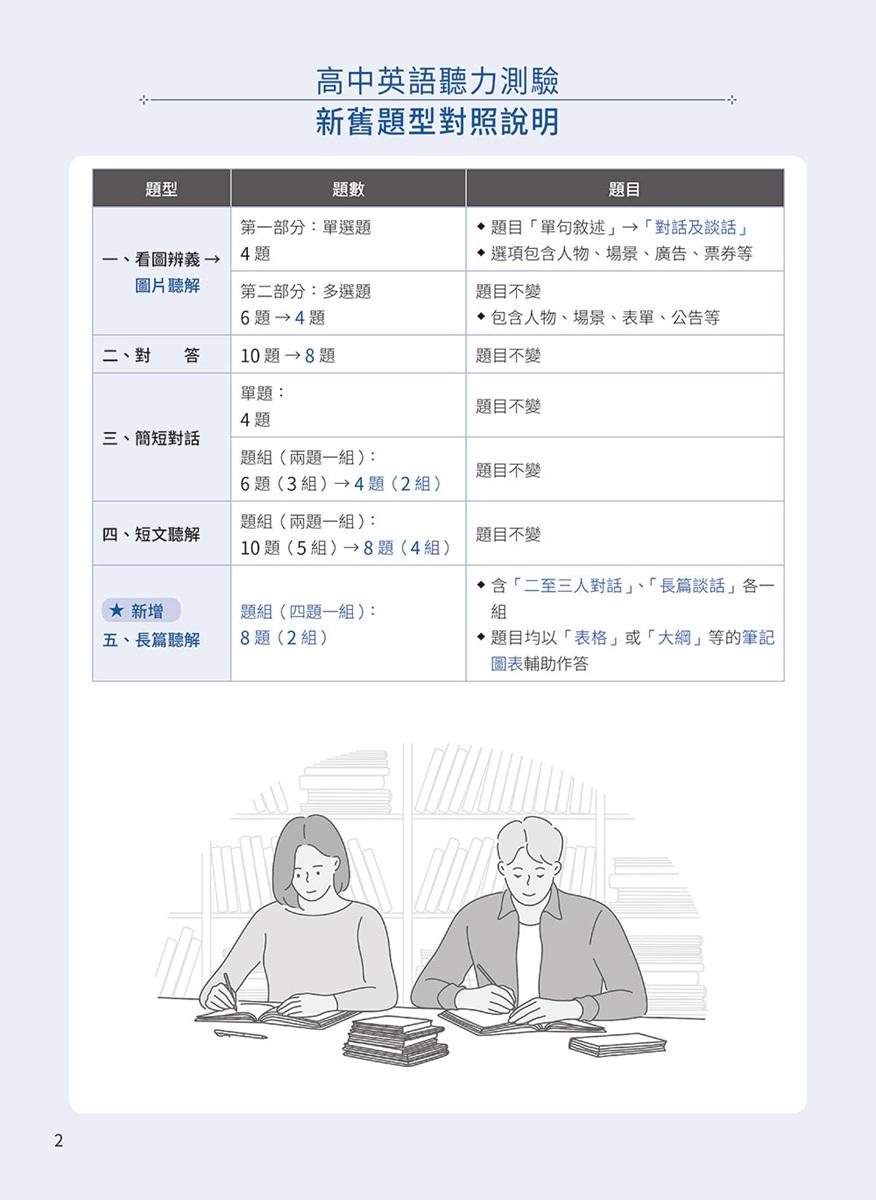 試題情境更貼近家庭、校園、教育文化、社交生活……等場景。此次新增的「長篇聽解」題型與輔以作答的筆記欄,更能提高考生整合運用能力。