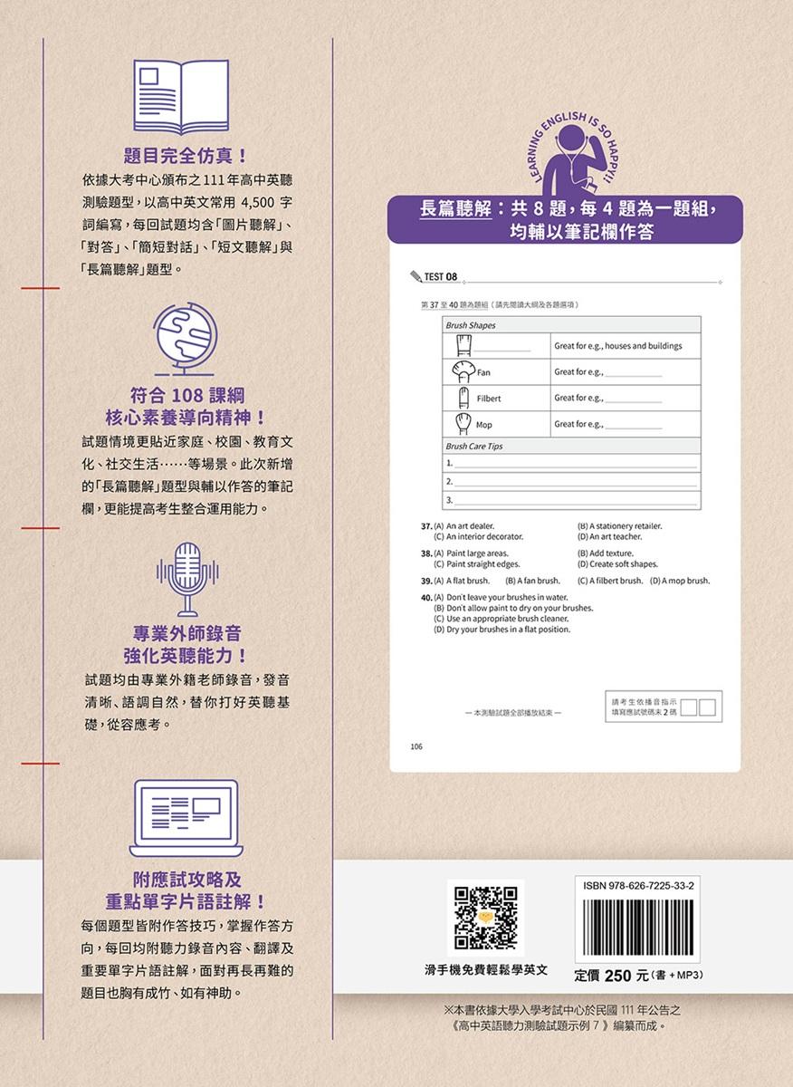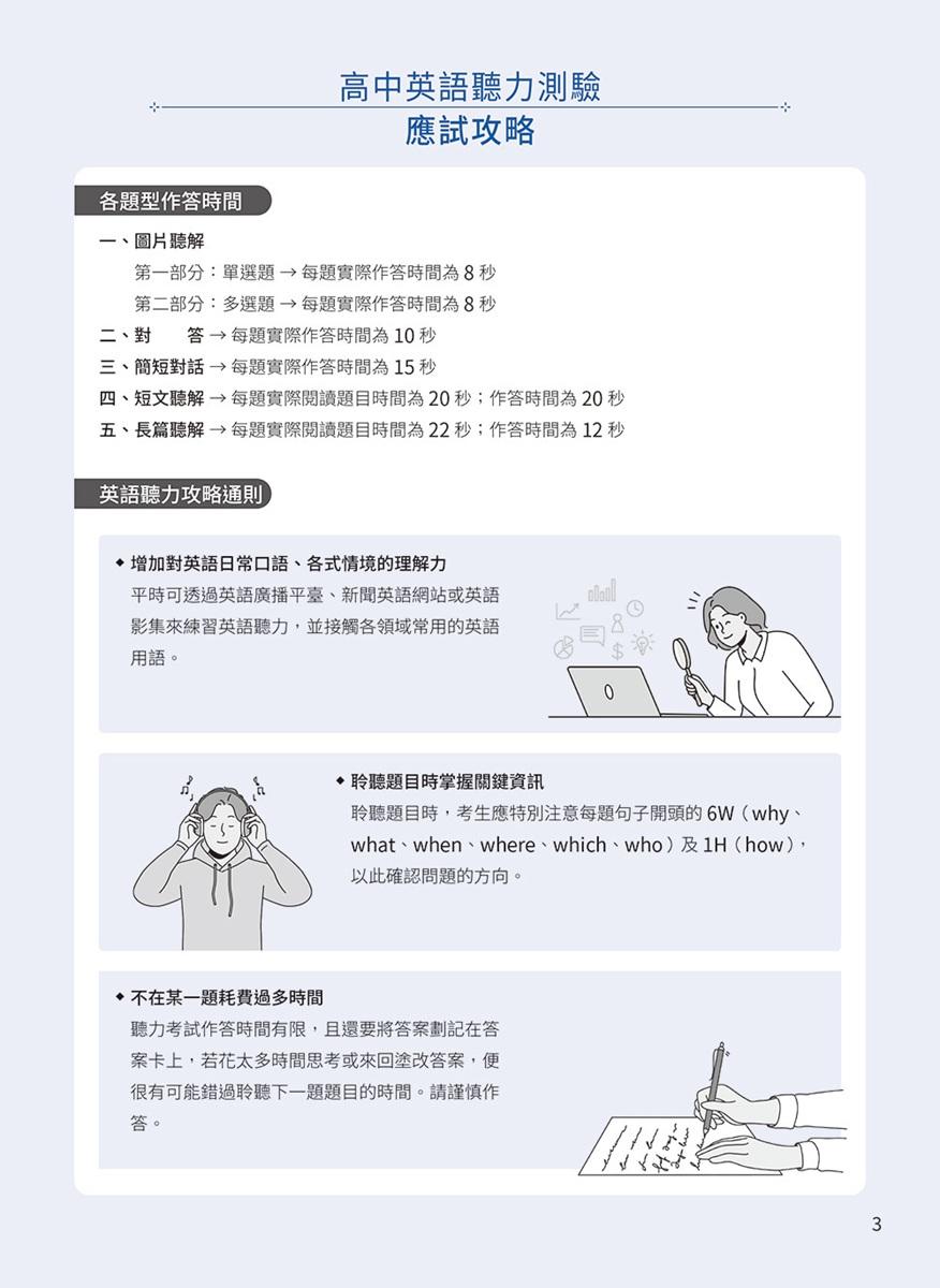 依據大考中心頒布之111年高中英聽測驗題型,以高中英文常用4,500字詞編寫,每回試題均含「圖片聽解」、「對話」、「簡短對話」、「短文聽解」與「長篇聽解」題型。