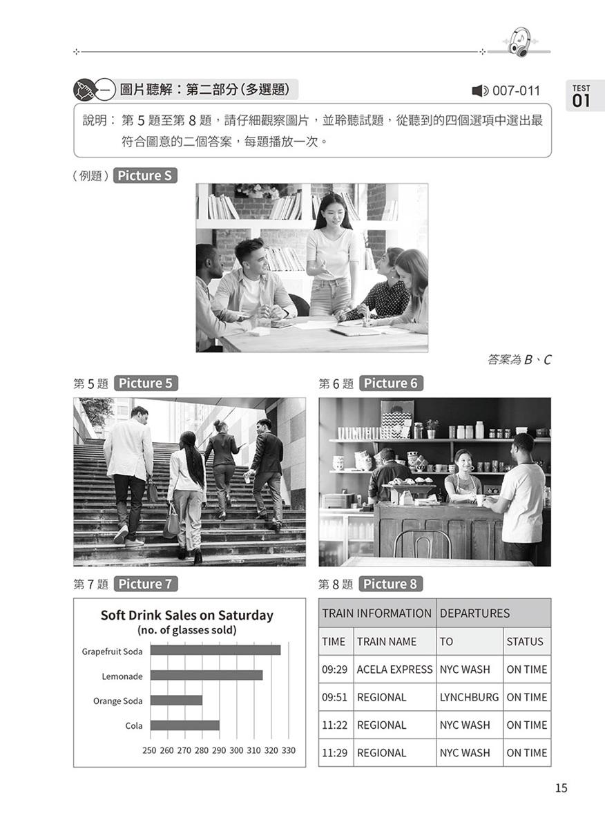 每個題型皆附作答技巧,掌握作答方向,每回均附聽力錄音內容、翻譯及重要單字片語註解,面對再長再難的題目也胸有成竹、如有神助。