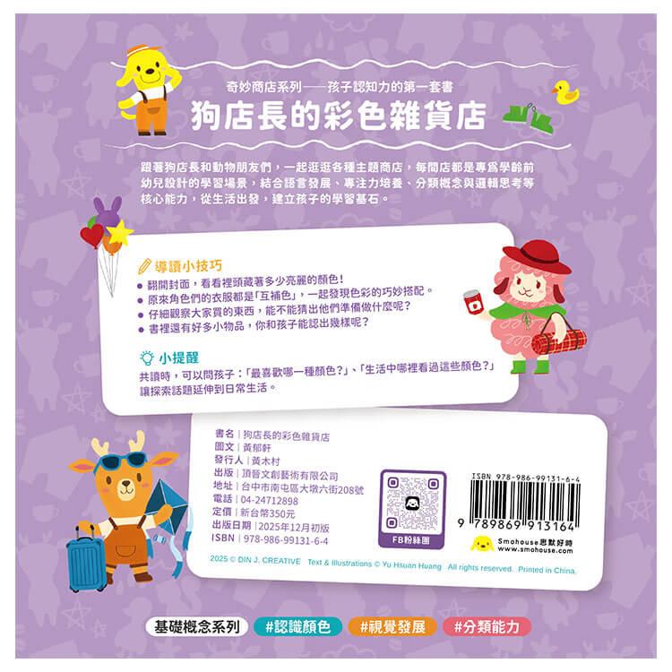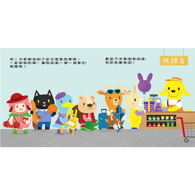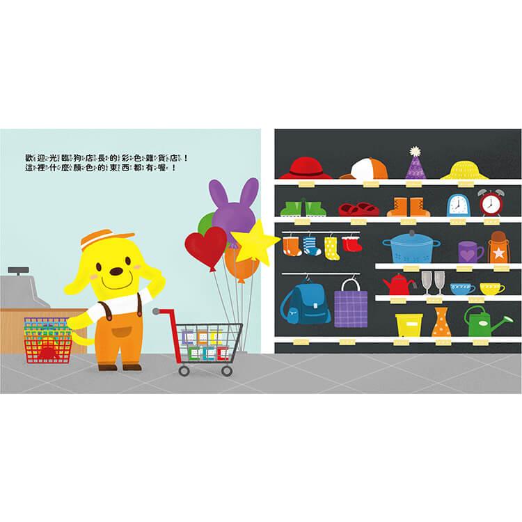 學習辨識顏色可以了解色彩的變化並且提升感知能力和觀察力。「狗店長的彩色雜貨店」以顏色+物品遊戲模式來幫助孩子聯想認識顏色,將顏色變的好玩有趣了!硬卡書設計,可以讓孩子重複、開心的翻閱,增加記憶力,也不怕破損喔!