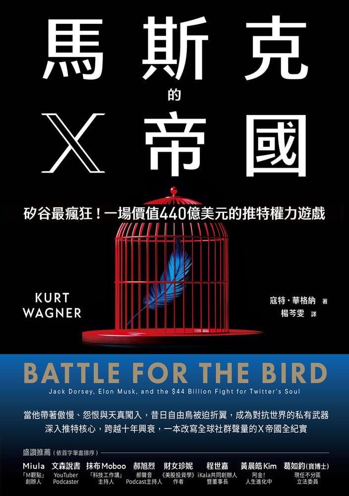 在《馬斯克的X帝國》中,寇特.華格納講述了一個扣人心弦的故事,關於控制推特這家全球最具影響力公司的高風險鬥爭,以及馬斯克、推特董事會與傑克.多西之間瘋狂、令人難以置信且混亂的戰役,而這一切都讓言論自由的概念懸於一線。——尼克.比爾頓(Nick Bilton),《孵化推特》(Hatching Twitter)作者、《浮華世界》(Vanity Fair)特派記者