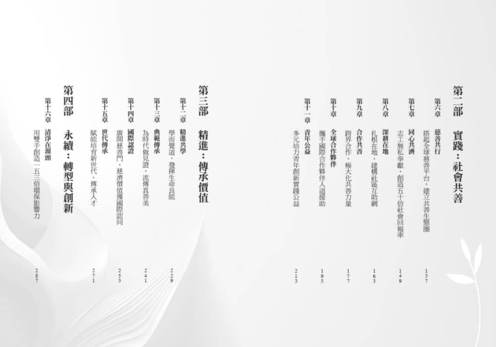 慈濟透過導入永續治理、ESG理念與高階人才培育,為非營利組織建立可複製、可長行的典範。此書不僅是慈濟的重要里程碑,更為全球公益治理提供珍貴的實踐智慧。——陳文章,台灣大學校長