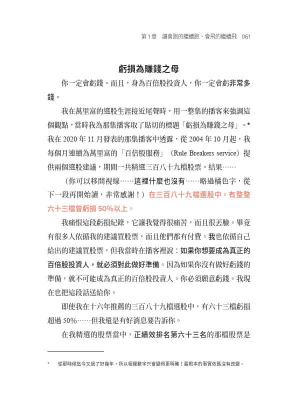 你也將透過第一部內容了解到,為何投資目的會永遠勝過利潤考量,以及為何就算市場波動跟貝比.魯斯(Babe Ruth)揮大棒時一樣激烈,你還是能透過「至少投資二十檔股票」(沒錯,二十檔!)來保持獲利。