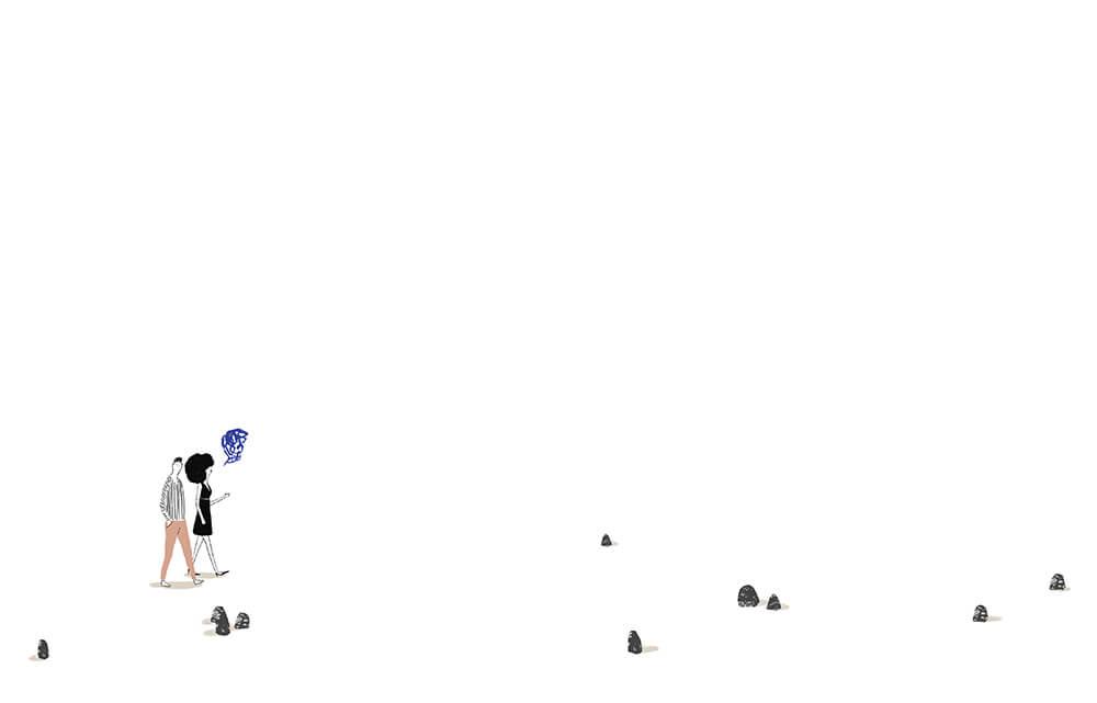 在大家各自散去的路上,讀者們會發現有的人說的話裡有藍色和橘色線團混在一起,這似乎也代表著:有的時候,對一件事的看法不一定總是那麼絕對的,你的意見可能和我不同,但也有我認同的某些部份。溝通,便成了人與人交流很重要的事了。