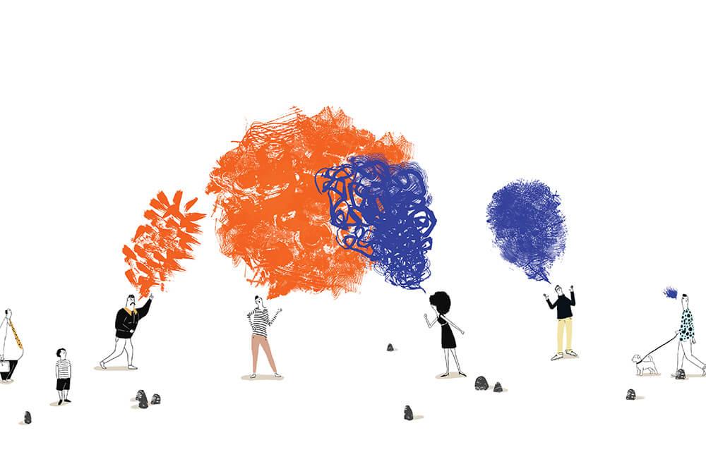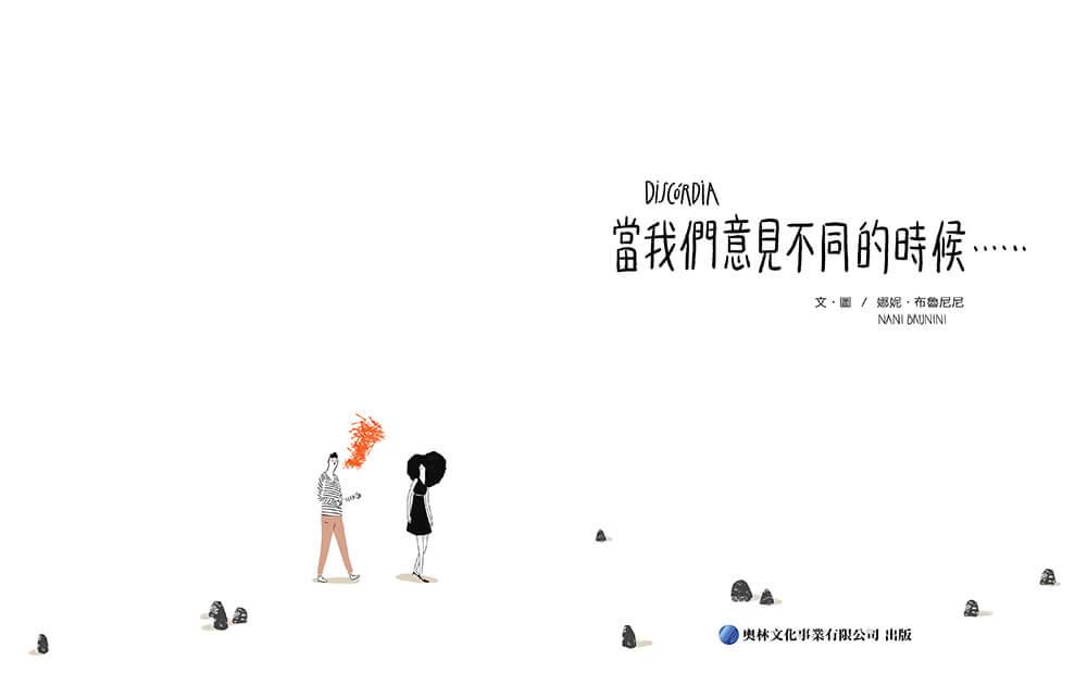 這是一本無字的繪本,但是藉由精準傳達情緒的圖像,讀者很容易便能讀懂這本書所要表現的意境。故事的開始是一男一女邊走邊聊,他們說什麼,讀者無從得知,因為沒有文字,作者只以一團藍色的線團表示女子說的話,男子說的話則是以橘色的線團代表。兩人談著談著,顯然是起了爭執,藍色和橘色的線團愈來愈大,甚至糾纏在一起。路人看了,也加入戰局。我們會看到路人有的說出的是藍色的線團、有的是橘色的線團,表示男女各有支持者。愈吵愈兇的眾人,頭頂上成了一片藍橘交織的混亂線團。唯一不參戰的是一個小孩和一隻小狗,他們在一旁自顧自地玩著。
