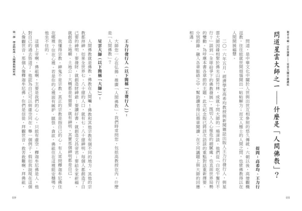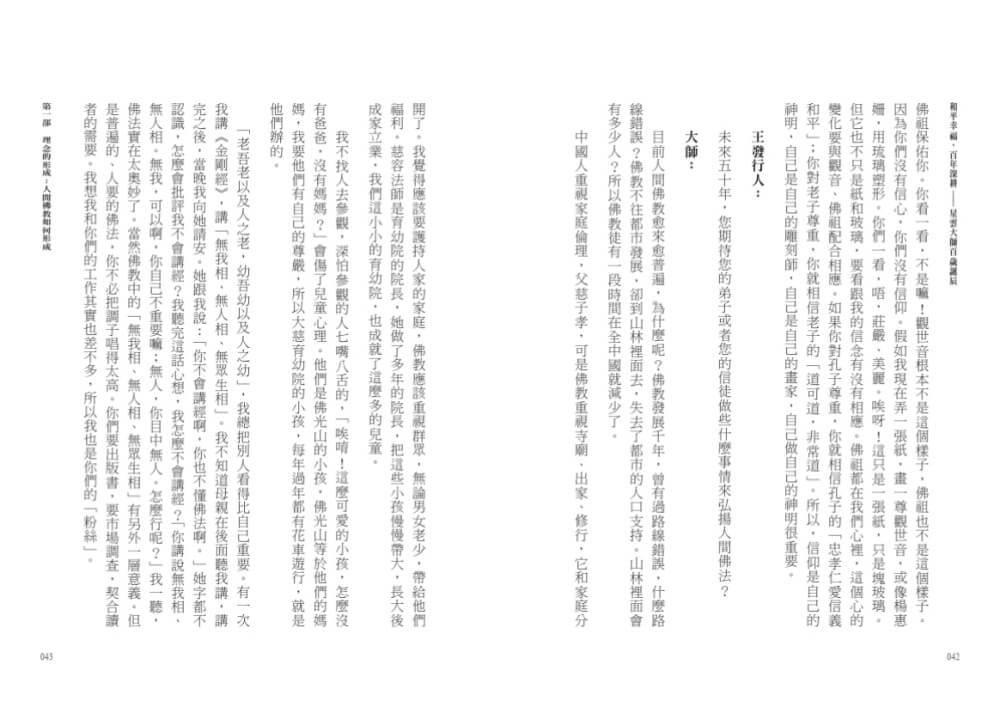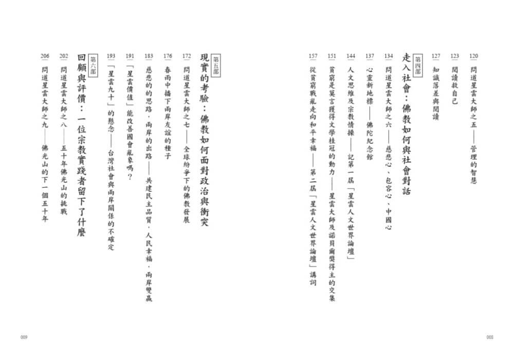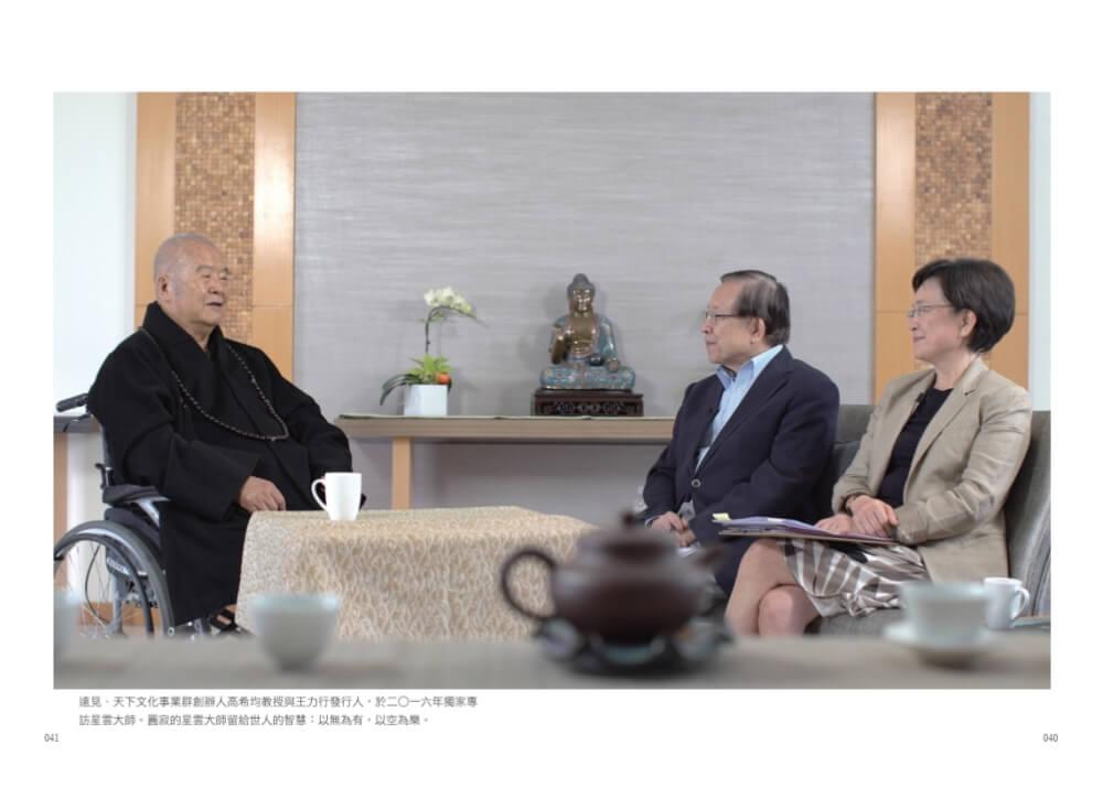 與星雲大師結緣30餘年。1989年,我們初識於台北的《遠見雜誌》。一位是行萬里路的和尚,另外是要出版萬卷書的書生,專業不同,卻一致關心台灣社會:如何在落後中走向進步,在理念差異中凝聚團結,在混沌世局中融入世界主流。這份關切與焦慮,使大師在廣大民意支持與宗教影響力之下,促使台灣社會更健康、更和諧與更文明。本書正是這些活生生的記錄。
