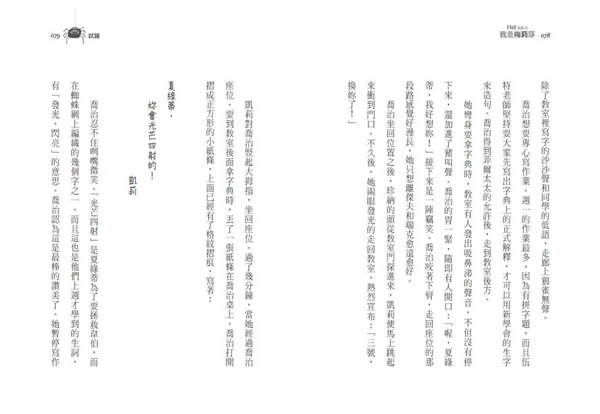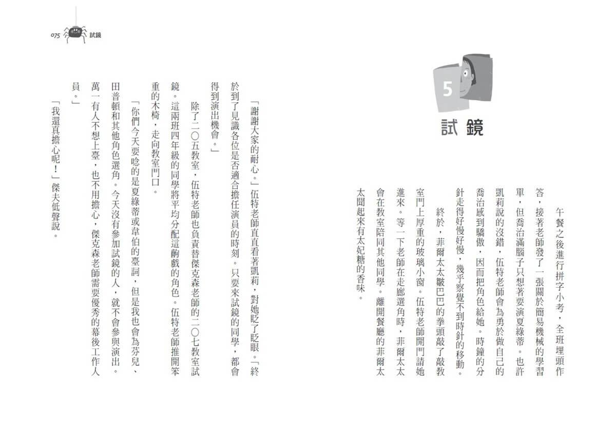 喬治慢慢打開教室的門,擔心會聽到笑聲,但同學都很專心寫著心得,沒人注意到她回來了。黑板上是伍特老師整齊的字跡:「個人心得」, 喬治拿出筆記本,寫上日期和題目。她才剛寫下夏綠蒂死了,寫作時間也到了。