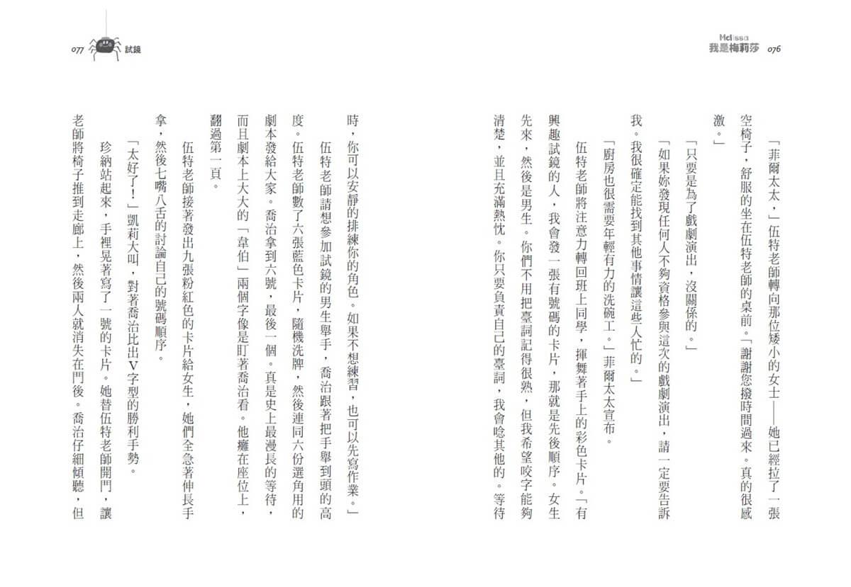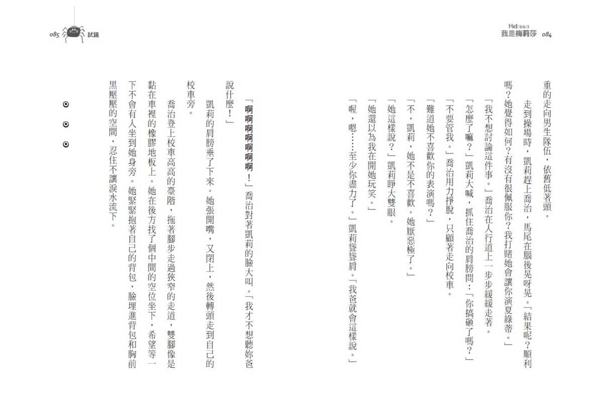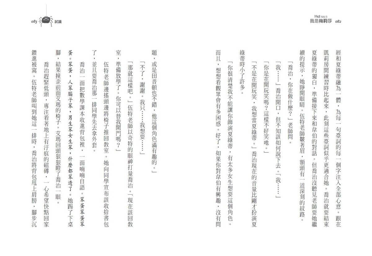 如果喬治在場,一定可以馬上融入,搭著這些女孩的肩,一起咯咯說笑。她會穿桃紅色的比基尼,留著一頭長髮——新朋友會很樂意為她編辮子。她們會問她叫什麼名字,她也會很樂意告訴她們,我叫梅莉莎。四下無人時,喬治會對著鏡中的自己叫梅莉莎,並且將紅棕色直髮往前梳,蓋住額頭,當成瀏海。