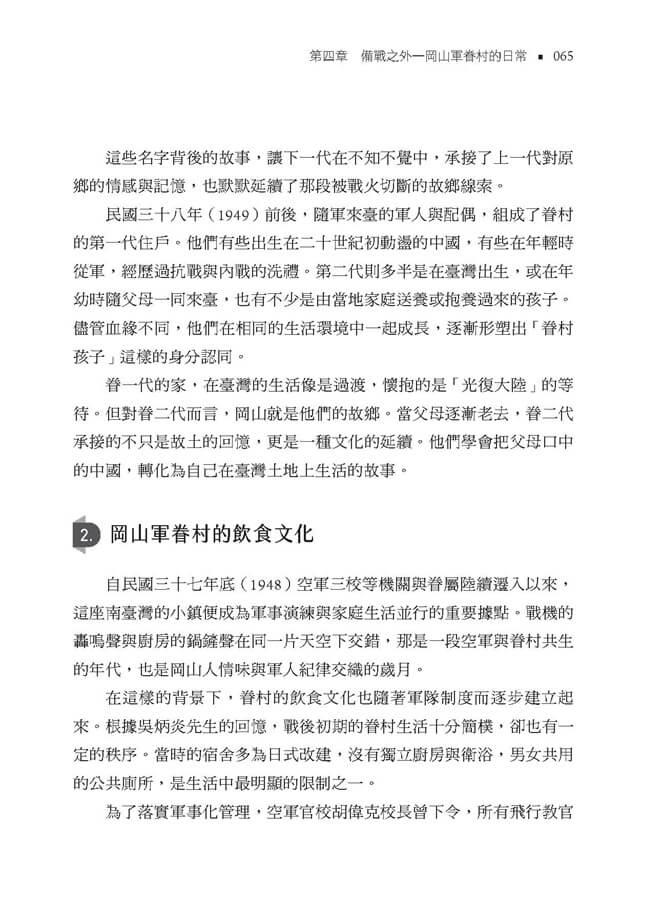 穿梭於歷史洪流與日常煙火之間,本書以眷二代的視角,回望岡山眷村的起源與成長。從日治時期的海軍航空隊基地,到戰後作為光復大陸的希望據點,再到眷屬們在此落地生根,岡山見證了國家歷史與個人命運的交錯。空軍將領與家人們承載著動盪年代的悲歡,也在柴米油鹽裡孕育出屬於自己的文化。