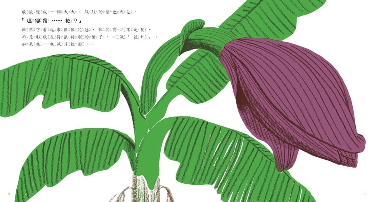 從發現冰過的香蕉會變黑開始,探討香蕉變黑的原因,循著線索,帶領孩子了解香蕉的生長環境,它是怎麼樣開花結果,分辨哪一種外觀的香蕉吃起來最香甜可口,以及香蕉從綠色外皮變成黃色外皮的差異和原因,透過可愛的繪圖和問題追索的方式認識香蕉。