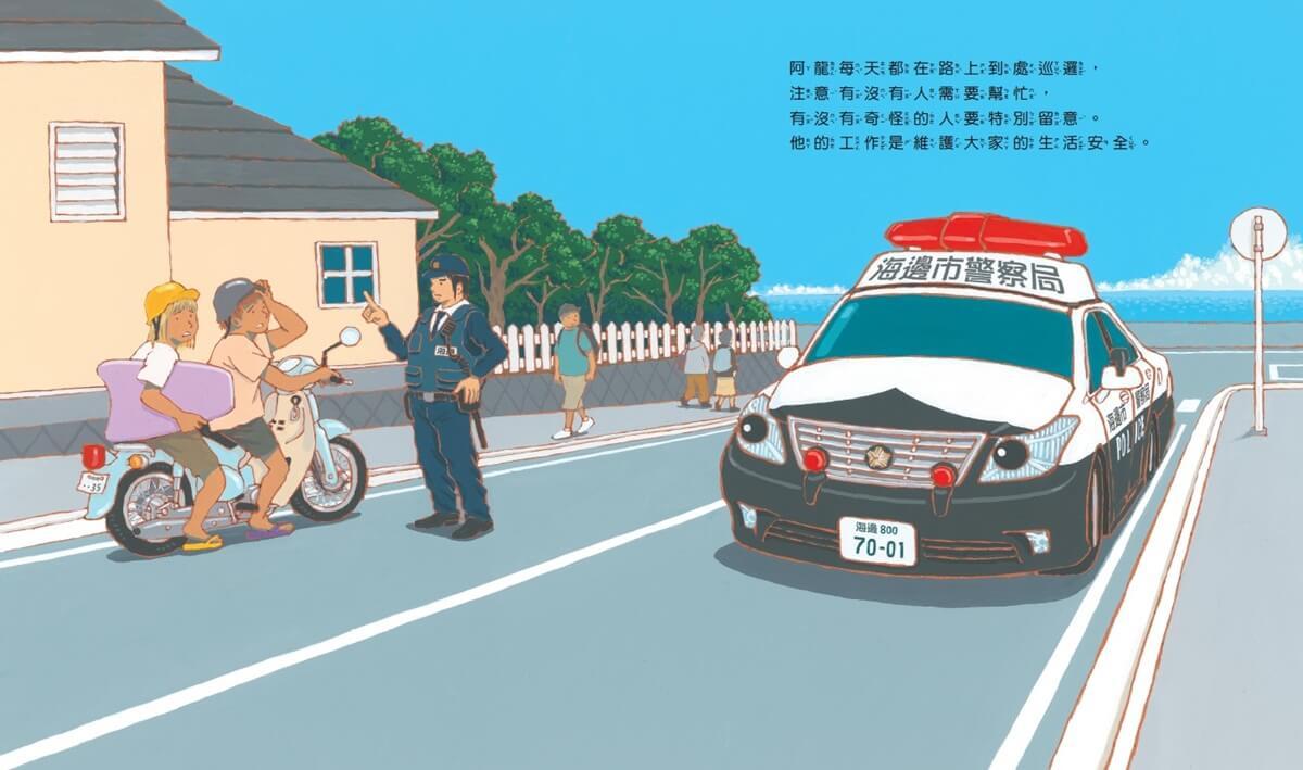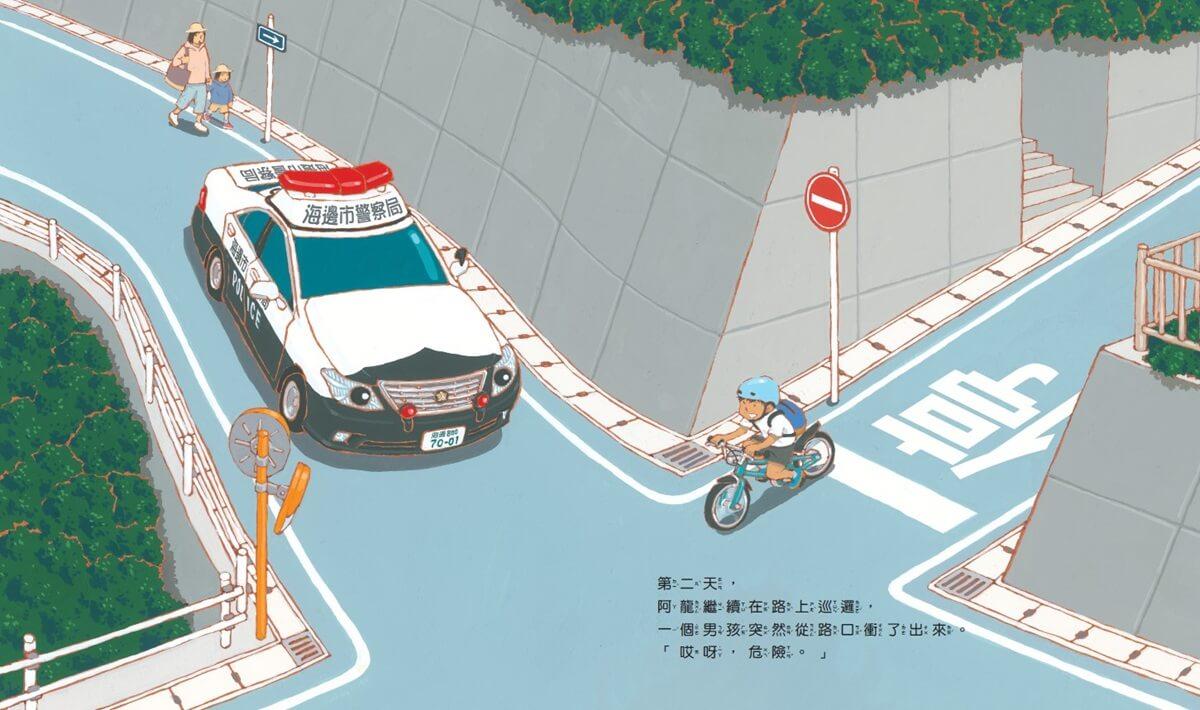 有一天,阿龍在巡邏時,遇到一位小朋友騎著踏車在路上橫衝撞,不守交通規則。
