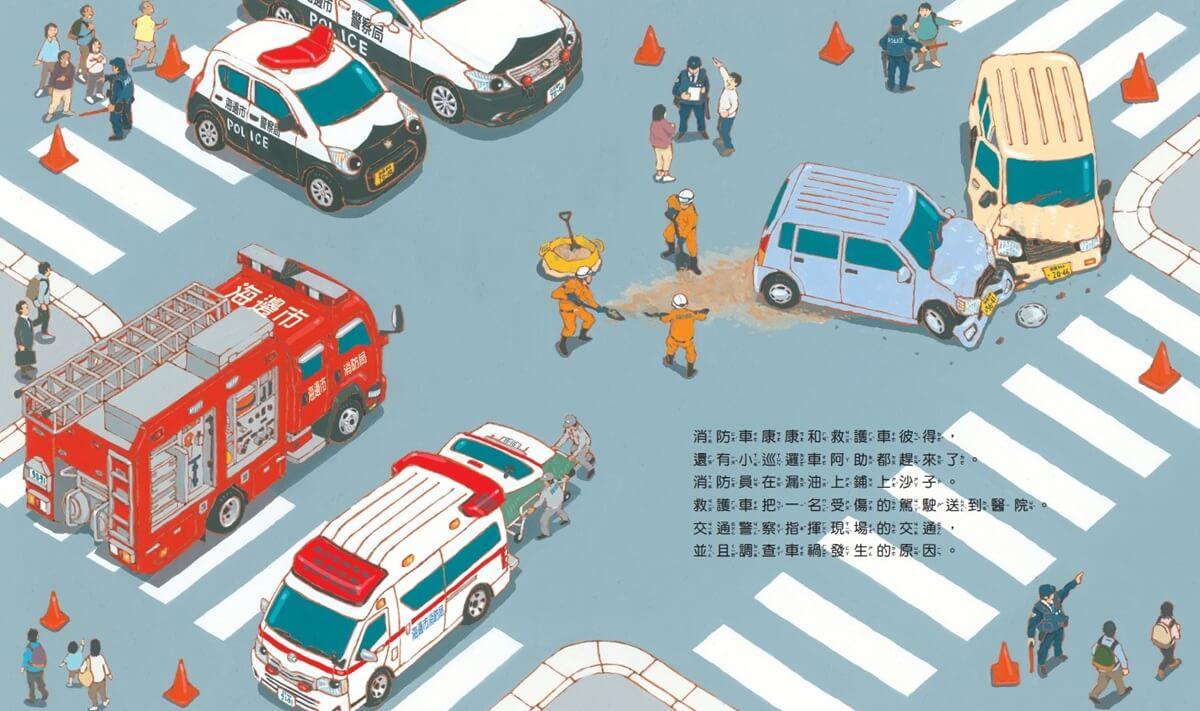 消防車康康和救護車彼得,還有小巡邏車阿助都趕來了。