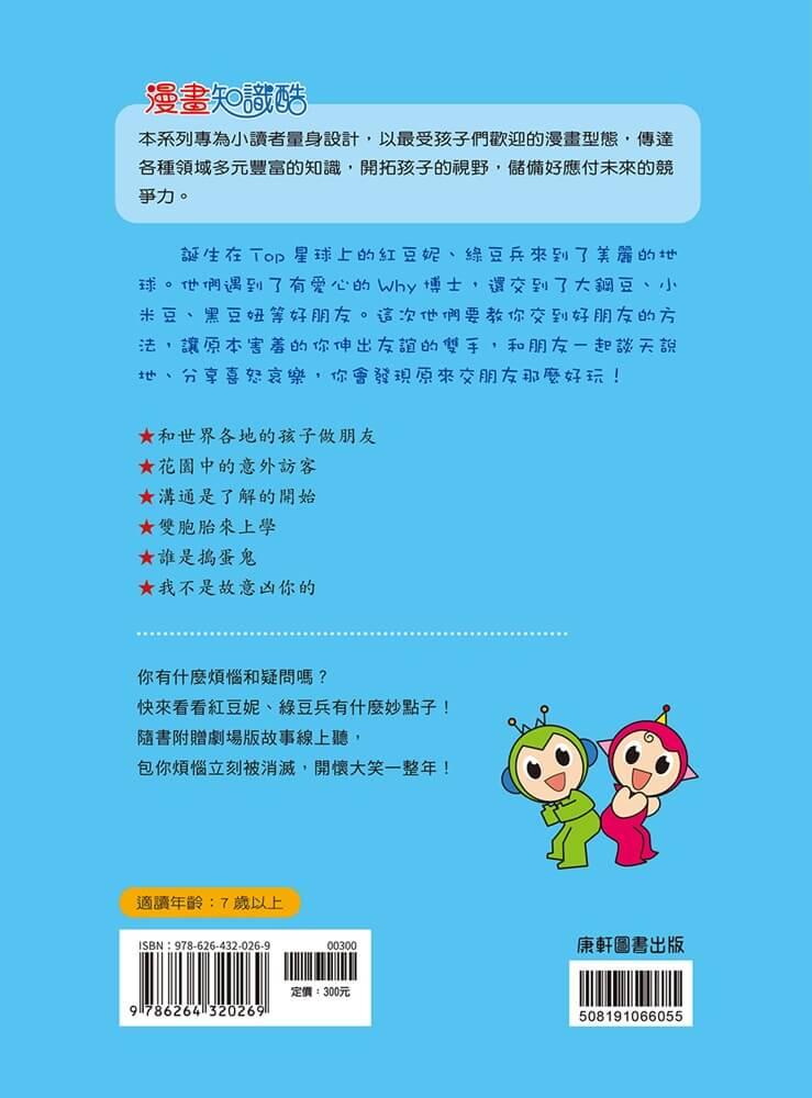 誕生在Top星球上的紅豆妮、綠豆兵來到了美麗的地球。他們遇到了有愛心的Why博士,還交到了大鋼豆、小米豆、黑豆妞等好朋友。這次他們要教你交到好朋友的方法,讓原本害羞的你伸出友誼的雙手,和朋友一起談天說地、分享喜怒哀樂,你會發現原來交朋友那麼好玩!