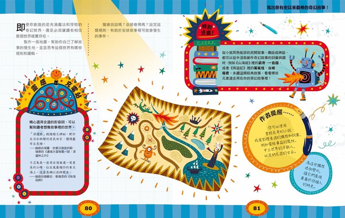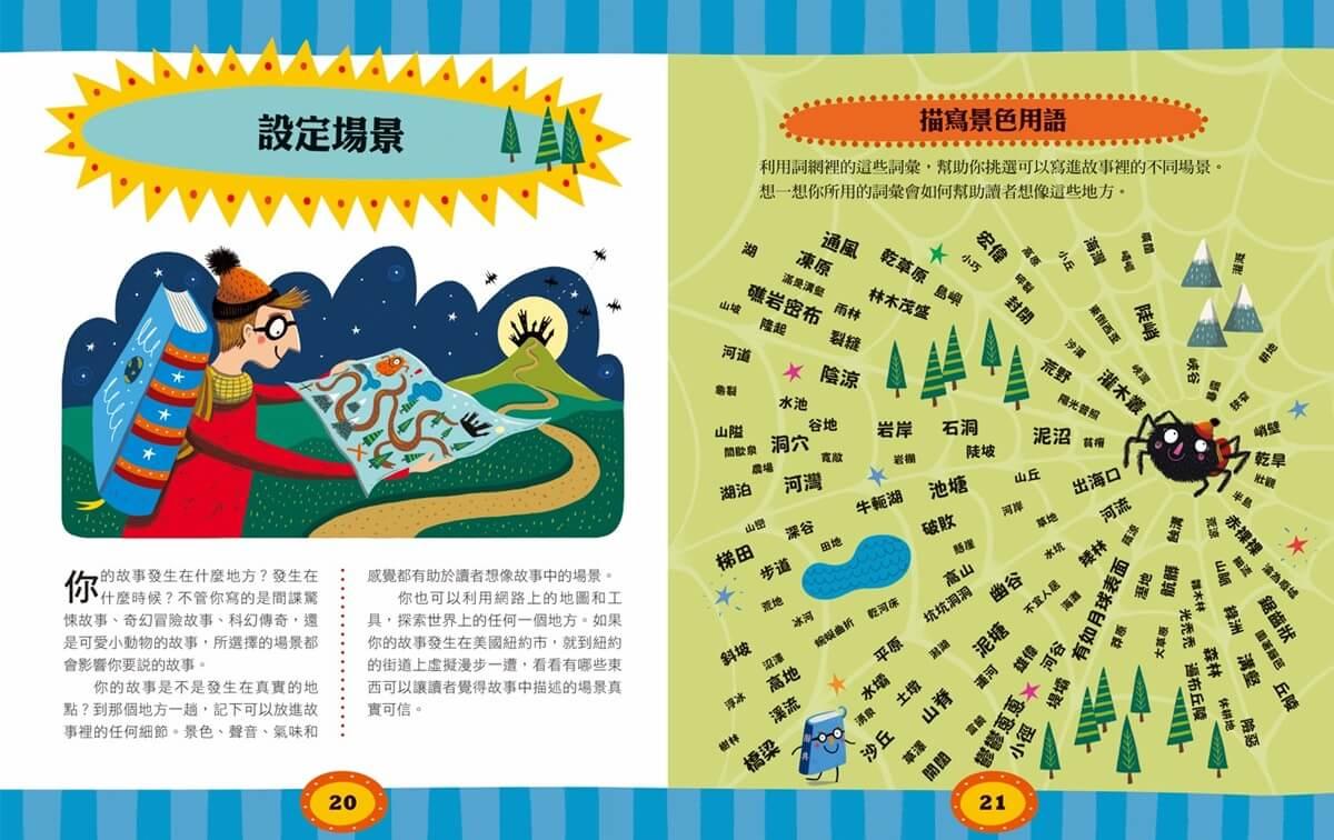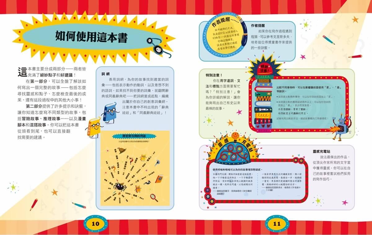 動筆之前,可以回頭細讀這本書的前半部,跟著書中導航,一步步設定自己故事裡的角色、情節、場景等核心要素。「作者提醒」還協助小讀者幫角色寫檔案,利用細節讓場景更逼真、讓情節更吸睛。