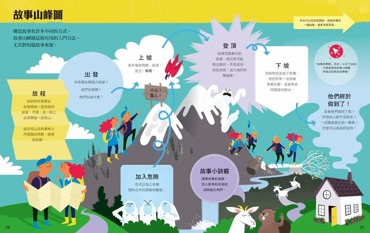 再者,有趣的比喻讓讀者清晰打通糾纏難理的寫作脈絡。例如,如何發展一個短篇故事,作者將之比喻為山峰。從山腳下即將開展的故事旅程必須出現的人物角色和基本場景,逐步上坡應該增添的寫作策略(加入新角色或拋出難題),再到登頂要能表現強烈懸疑感的戲劇性高潮,繼之下坡要持續解決問題或誤會,並至結束旅程時將促成什麼結局。圖文並茂的故事山峰圖將故事從起點到終點,化抽象為具體,讀者能一目了然,一點就通。