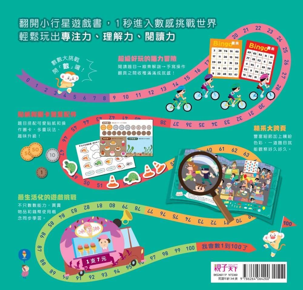 除了找一找、圈一圈、辨別顏色、成雙成對等基礎挑戰,本書還加入貼紙與圖卡配件,搭配撲克牌、賓果、布置水族箱等多種數數玩法。孩子一邊動手操作、一邊動腦思考,挑戰更有變化,也更好玩。