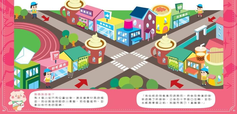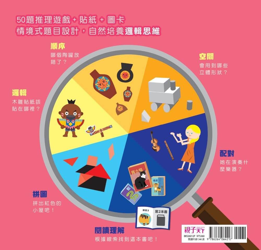 題目涵蓋順序、拼圖、配對、空間、閱讀理解與邏輯6大類題型,變化延伸出50個精采有趣的推理遊戲。讓孩子沉浸在解謎挑戰當中,在不知不覺間培養分析、理解與關連思考力。不只好玩刺激,更可以全方位鍛鍊大腦的多元運思能力。