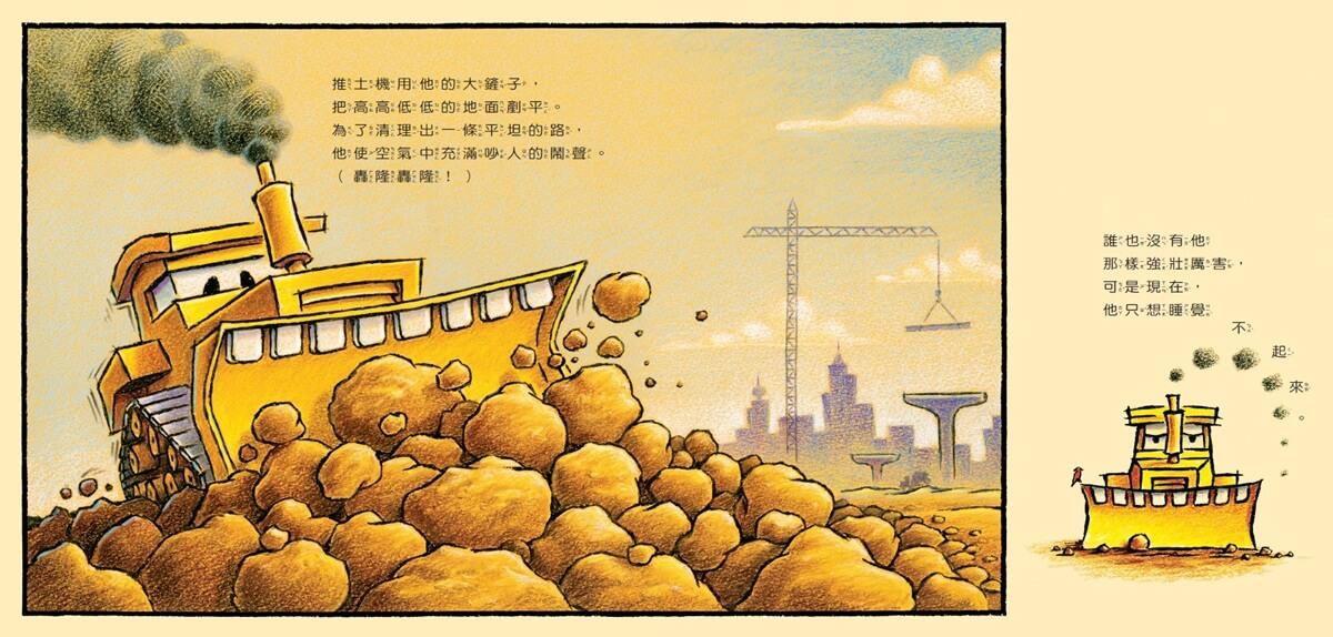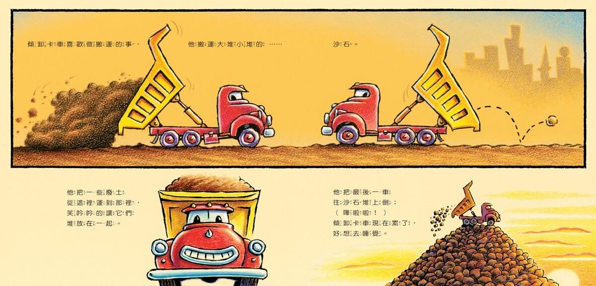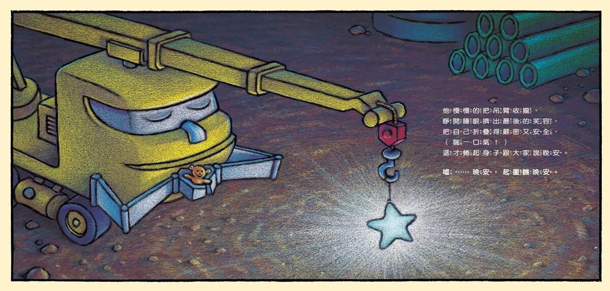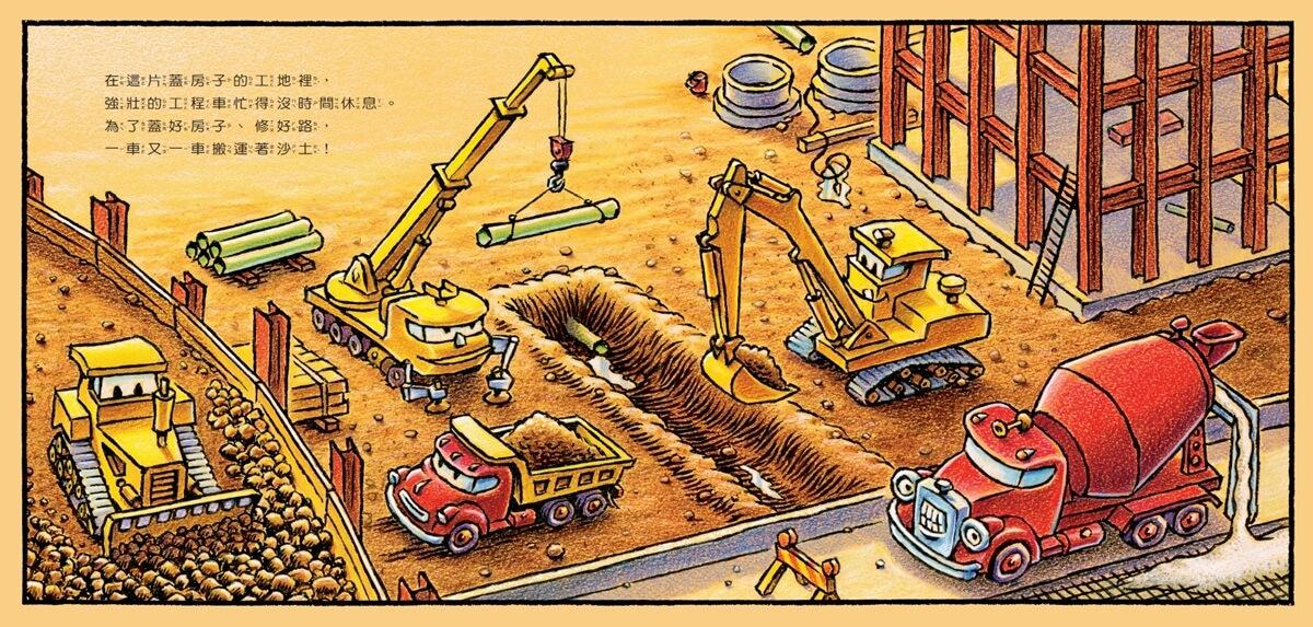 太陽下山了,天色愈來愈暗,該是說晚安的時候,就連強壯的工程車也不能再玩。起重機、混凝土拌合車、傾卸卡車、推土機、挖土機,一個接一個結束了工作,洗好澡,關掉引擎、燈光,準備上床去睡覺!
