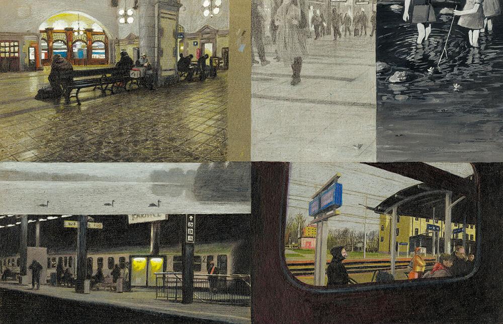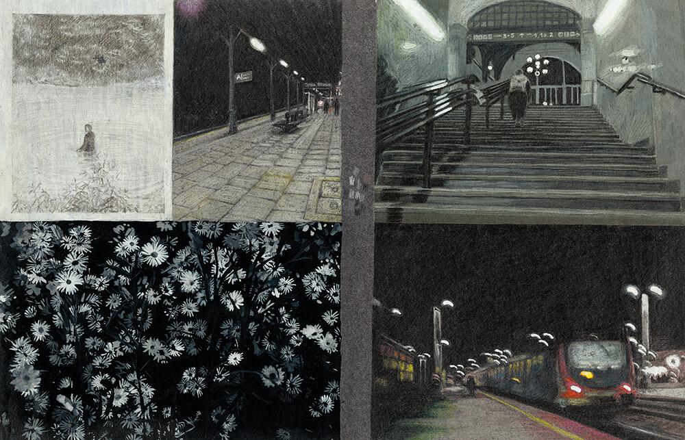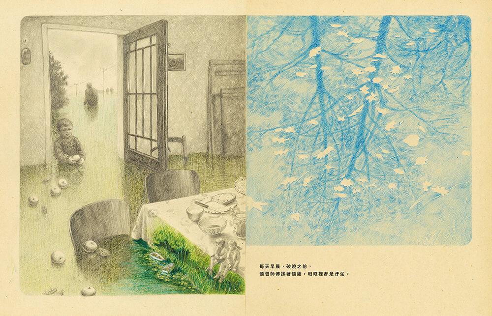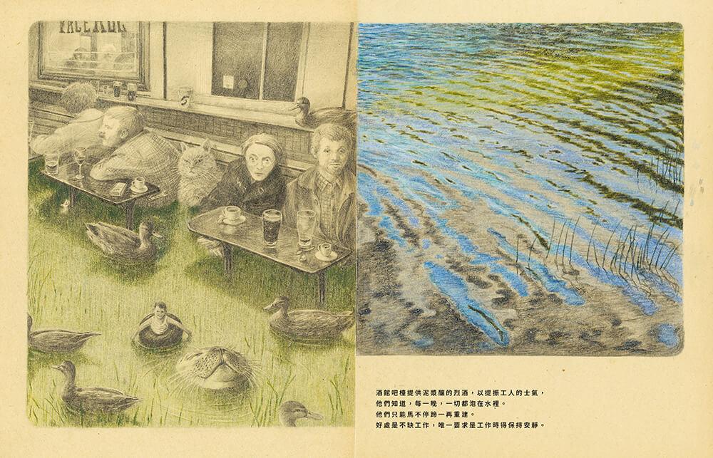 曾說過「圖像不應該重複文字已經說過的事」的尤安娜,在書一開頭就以連續的全景畫面和相簿般的畫面切片將讀者吸入有如披頭四名曲〈生命中的一天〉(A Day in the Life)的氛圍之中。你看到彷彿不同時間的湖面光影,時時變化、但一日復一日。書名頁之後畫風轉成淡淡的鉛筆和色鉛筆,故事敘述進入另一個脈絡: