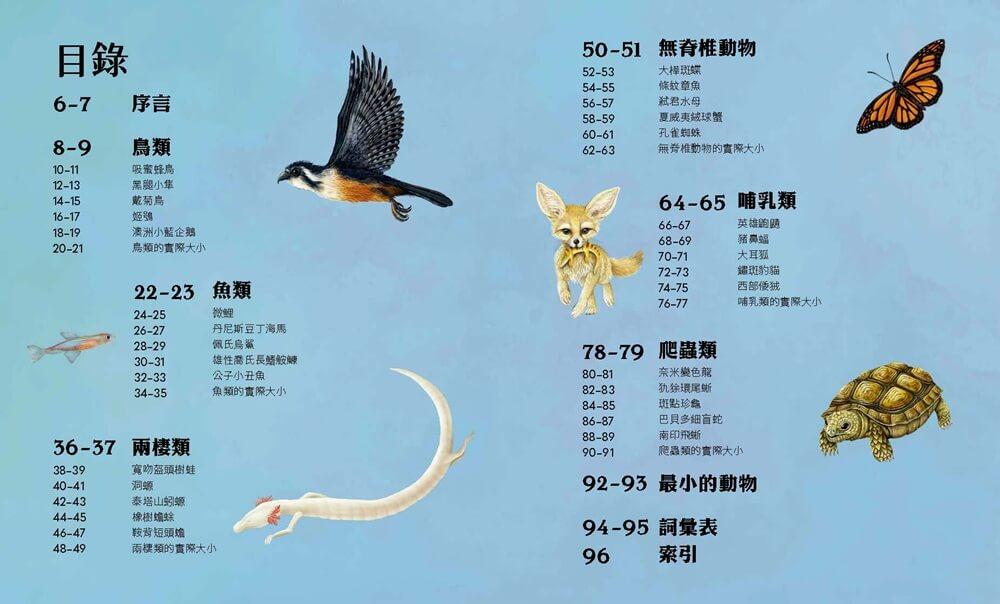 打開這本書,讓美麗的鳥兒、五彩繽紛的小丑魚和最嬌小的蜥蜴,帶你發現大自然裡的迷你動物遇到哪些考驗,又有哪些優勢。