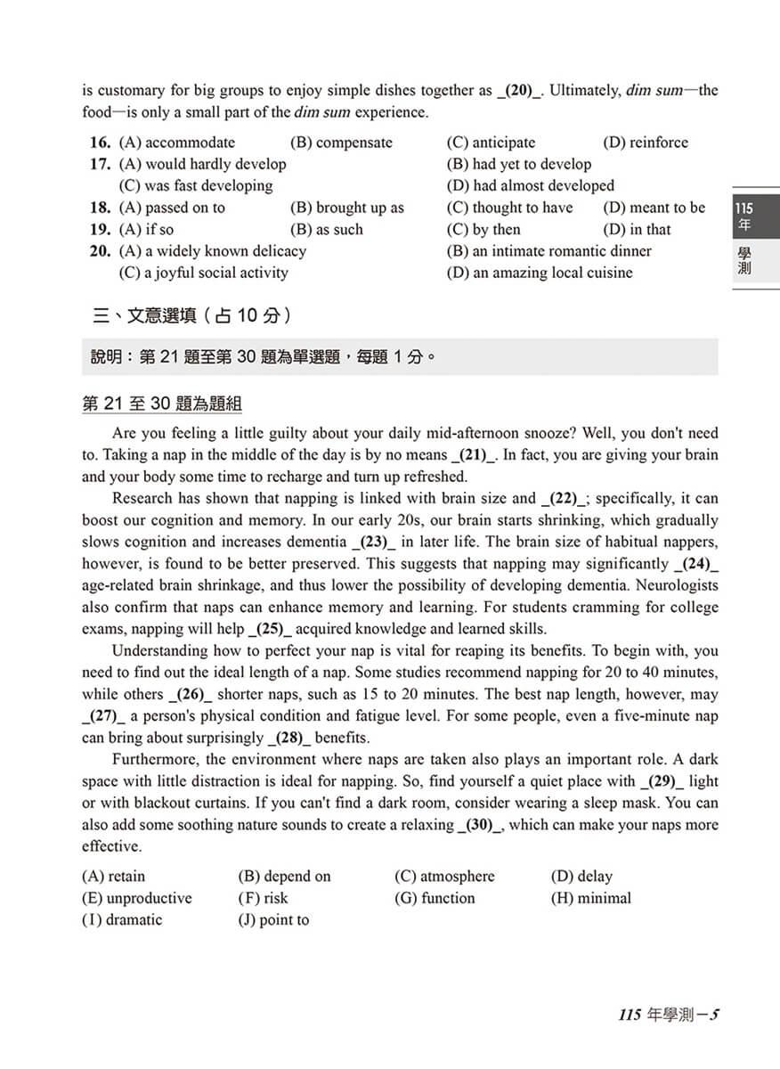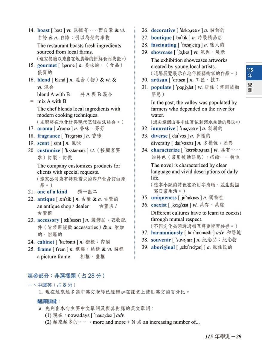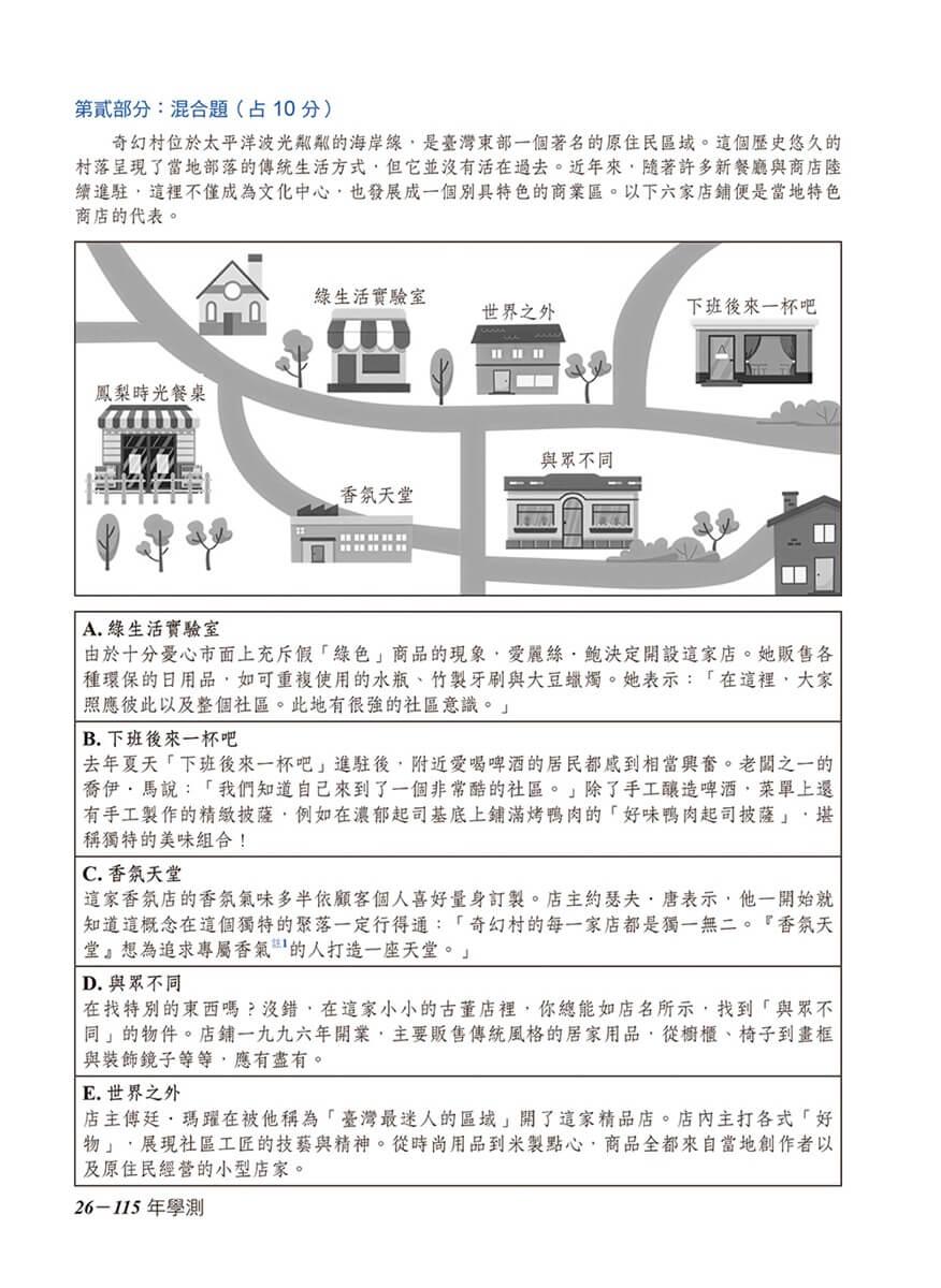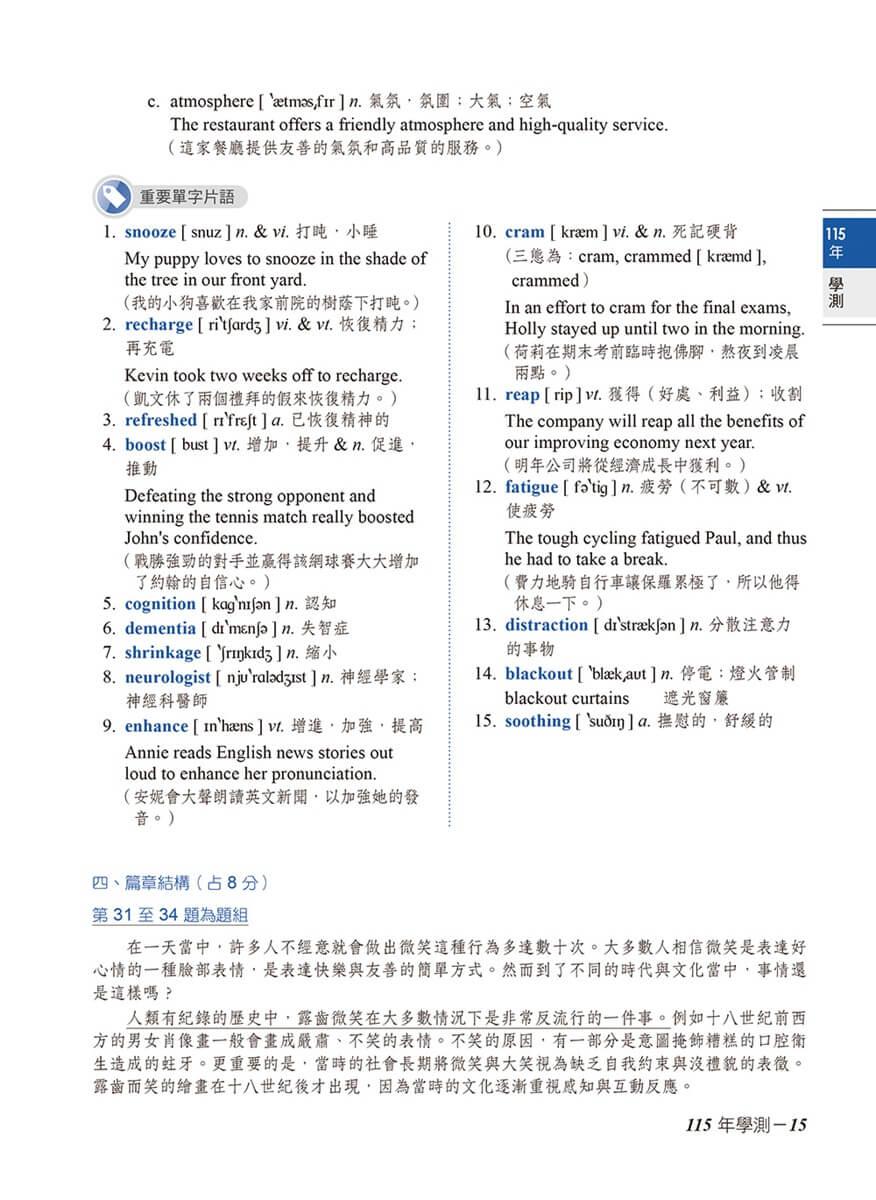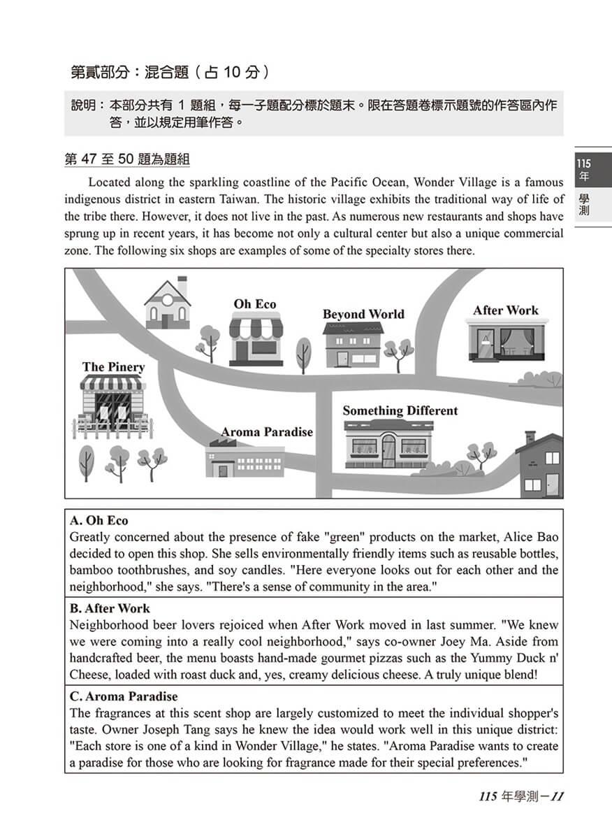 新制學測英文考題融合歷屆學測、指考與108課綱核心素養的命題精神,與以往的學測最大不同點在於新增兩種題型:篇章結構與混合題。「篇章結構」雖是舊式學測未曾出現的題型,卻是指考必考題型,且從115學年度開始,本題型由原先的4個選項搭配4個答案,改為5個選項搭配4個答案;為兼顧考生需求,我們納入近五年指考試題與詳解,不但可以多練習篇章結構,更能挑戰難度較高的試題。「混合題」則為新制學測的另一特點:打破以往閱讀測驗選擇題的出題方式,以核心素養為主軸,考生需將文章內容融會貫通之後,再以選擇、勾選或是手寫方式回答問題,題目可能是擷取文章訊息,也可能是找出段落主題句……等。以115年的題目為例,考生需閱讀一篇關於臺灣東部原住民商業區的介紹文,了解各商店的特色,而後依照題目要求,從中找出2個單詞,並依句型結構適度變化後填入作答;另一題為多選題,考生需依題目內容挑選正確的商店填入代號;最後則為簡答題,依題目內容從文章中挑選單詞做答。