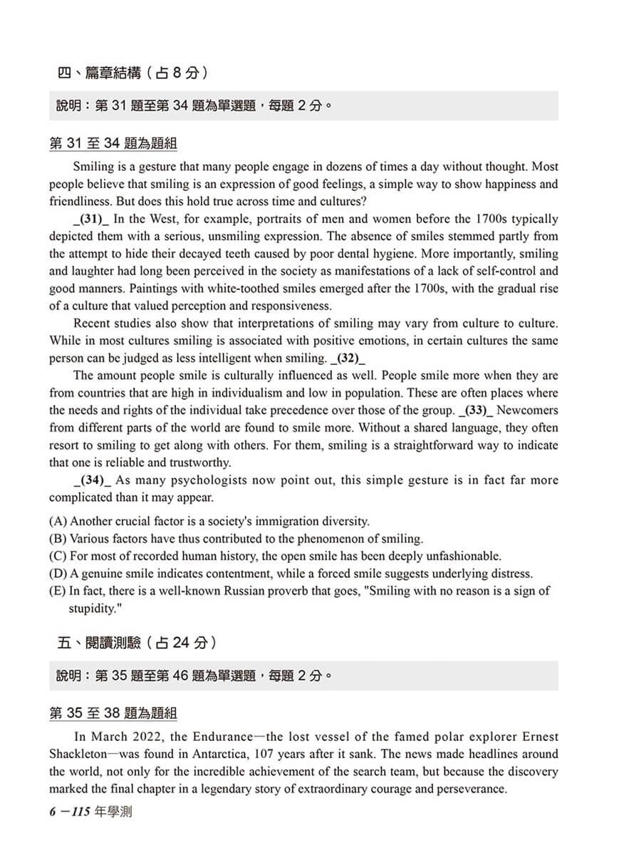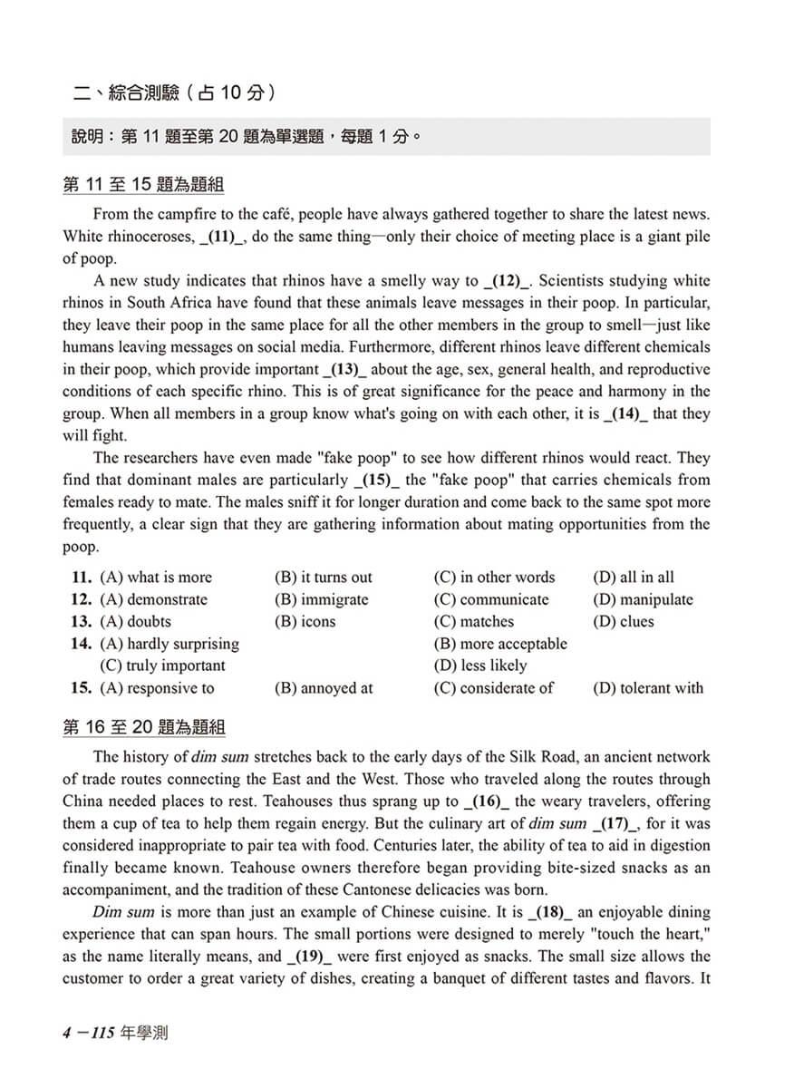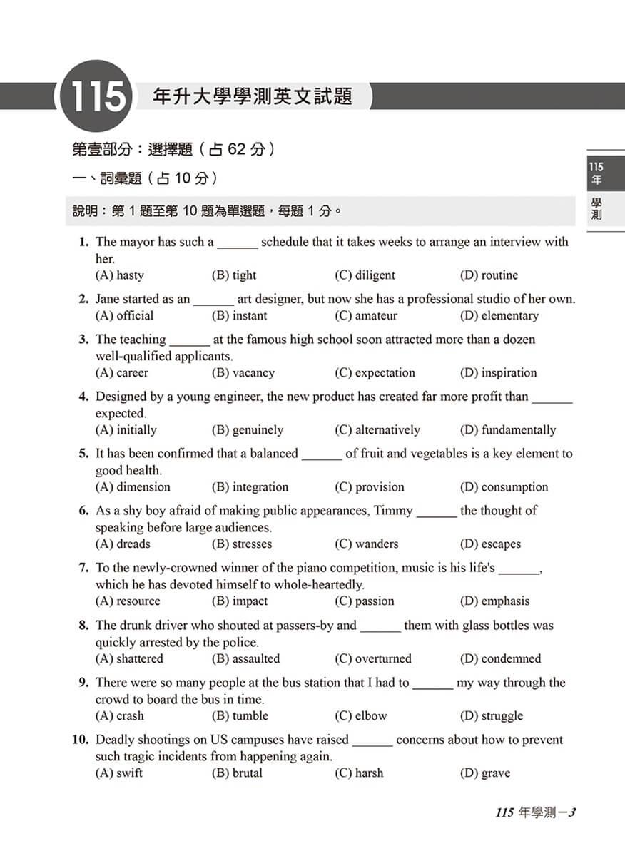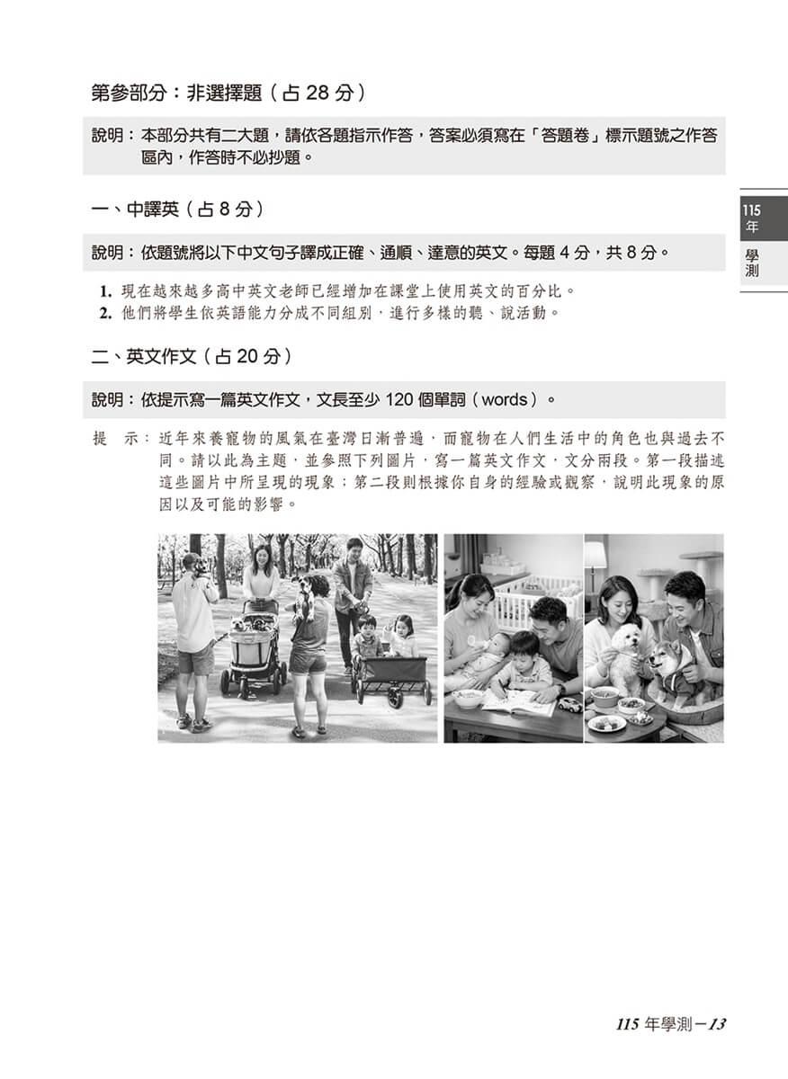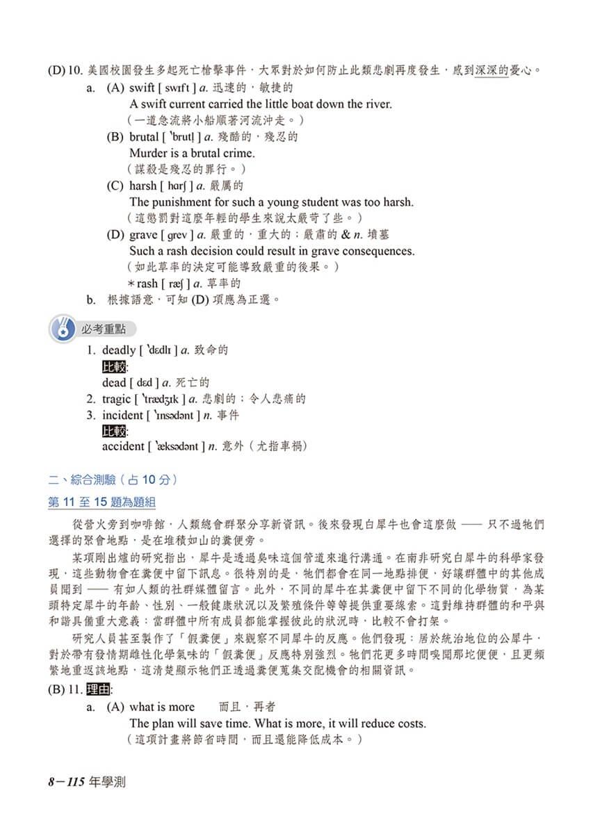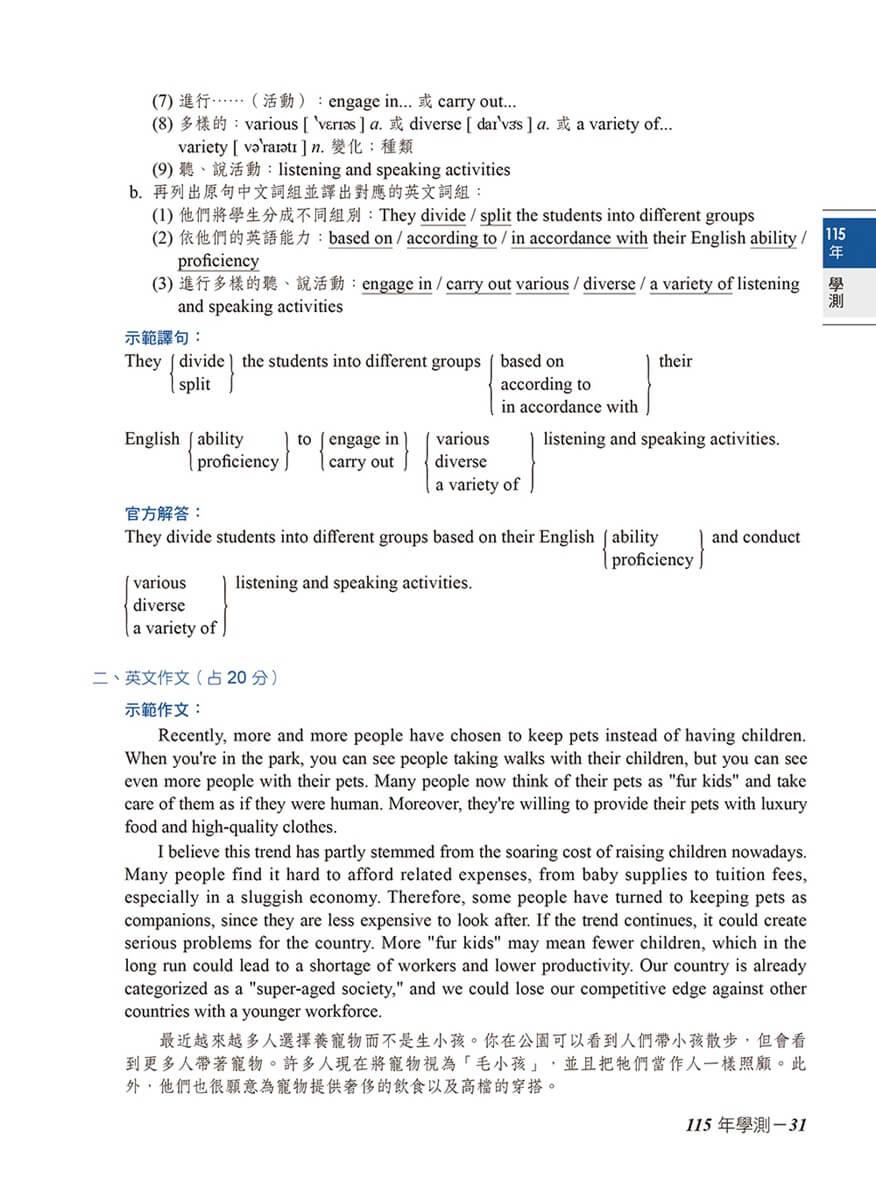 新制學測英文考題融合歷屆學測、指考與108課綱核心素養的命題精神,與以往的學測最大不同點在於新增兩種題型:篇章結構與混合題。「篇章結構」雖是舊式學測未曾出現的題型,卻是指考必考題型,且從115學年度開始,本題型由原先的4個選項搭配4個答案,改為5個選項搭配4個答案;為兼顧考生需求,我們納入近五年指考試題與詳解,不但可以多練習篇章結構,更能挑戰難度較高的試題。「混合題」則為新制學測的另一特點:打破以往閱讀測驗選擇題的出題方式,以核心素養為主軸,考生需將文章內容融會貫通之後,再以選擇、勾選或是手寫方式回答問題,題目可能是擷取文章訊息,也可能是找出段落主題句……等。以115年的題目為例,考生需閱讀一篇關於臺灣東部原住民商業區的介紹文,了解各商店的特色,而後依照題目要求,從中找出2個單詞,並依句型結構適度變化後填入作答;另一題為多選題,考生需依題目內容挑選正確的商店填入代號;最後則為簡答題,依題目內容從文章中挑選單詞做答。