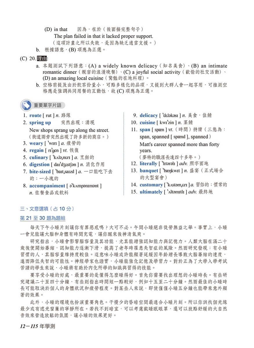 此外,為了讓考生多加熟悉新制學測的考題,在本書中特編入110年試辦學測試題並加以詳細解析、翻譯,期望讀者能充分利用,提升應考戰力。