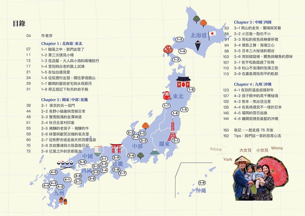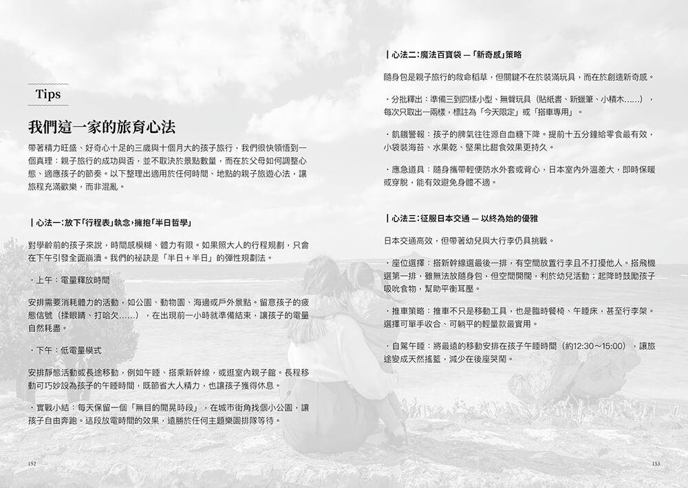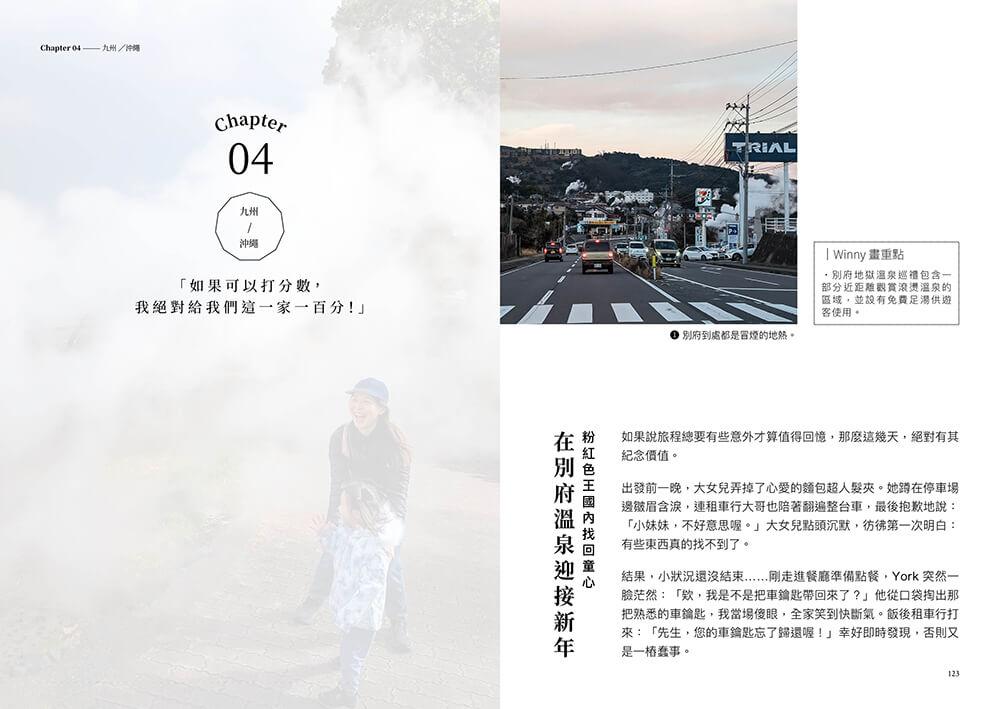 帶孩子去旅行,往往是父母既憧憬又懼怕的挑戰;這一次,Winny 勇敢踏出「親子旅育」的第一步,將兩人成行升級為一家四口同遊,展開一場從日本北海道到沖繩、長達七十五天的親子大冒險。過程中突發狀況如家常便飯,荒腔走版可謂常態,即便是身經百戰的背包客,也難免落入手忙腳亂的窘境,因而領悟那些才是親子旅行的真實面貌。說真的,要是一路順遂才奇怪!正是各種突如其來的難題,成就了一段生動的書寫,本書如實地記錄了旅途情境下的親子互動,如何帶著兩個小麻煩克服交通、住宿、飲食、行程等重重關卡,如何從錯誤中習得育兒新技能,如何有驚無險地日復一日。