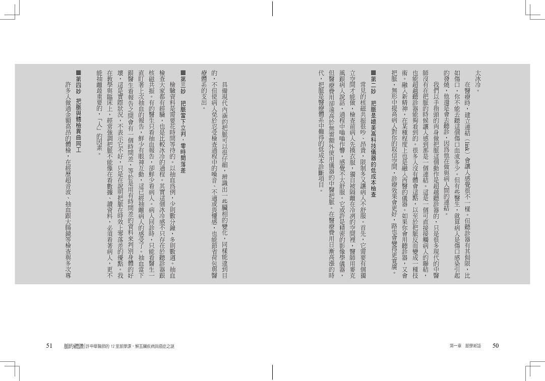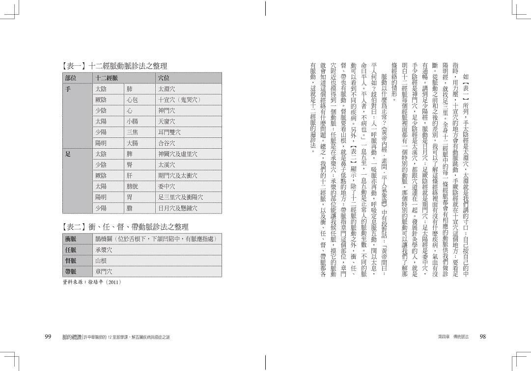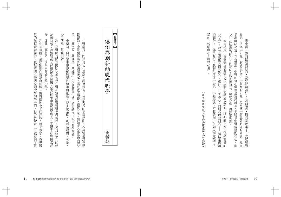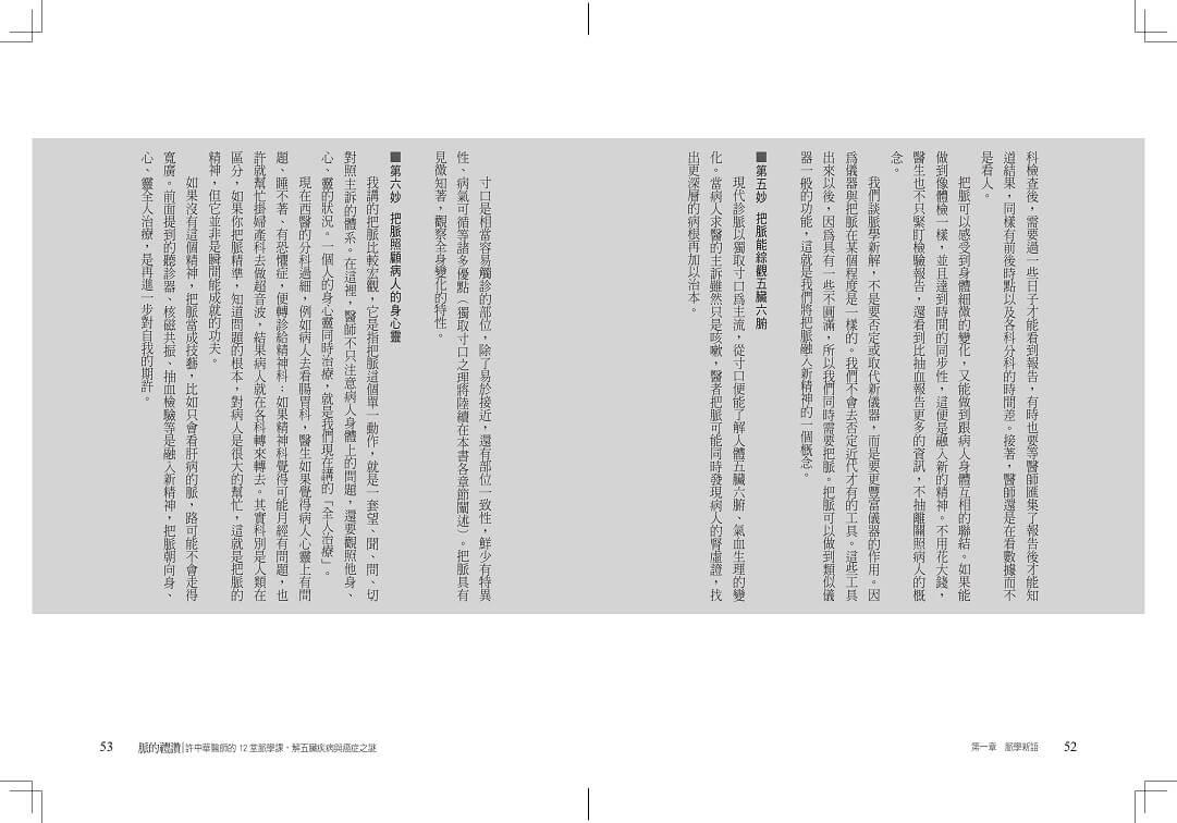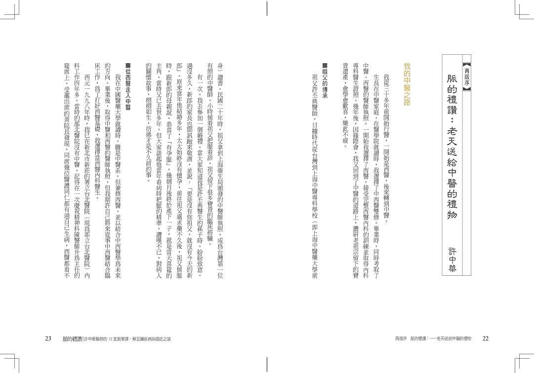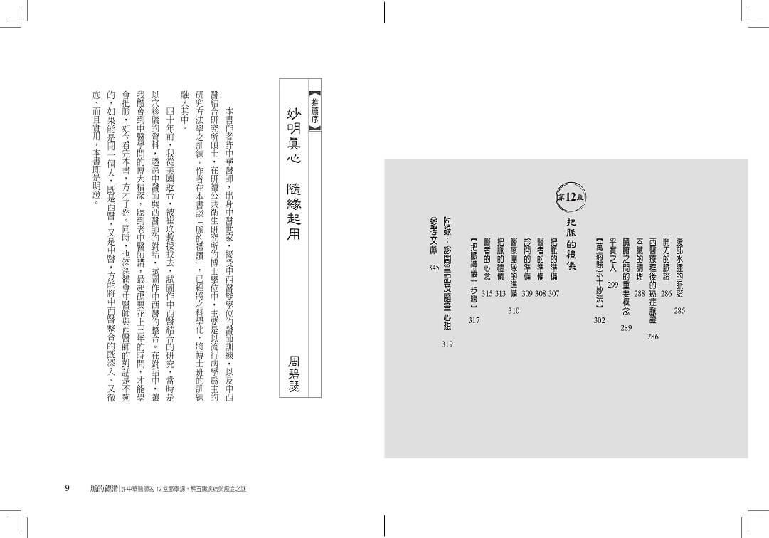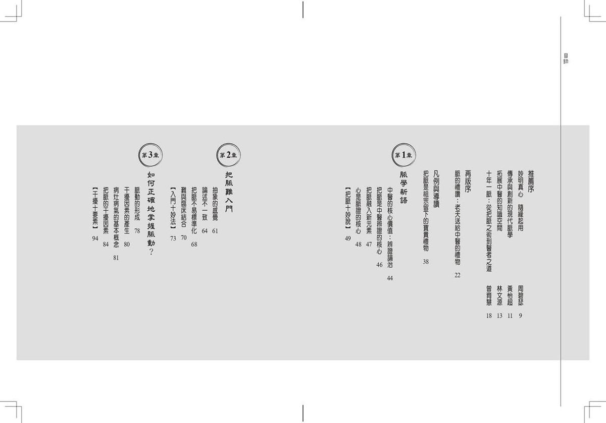 要完成一本書,真的很不容易,感謝這些年來許多人的協助,才有機會由課堂上的筆記、講義,再彙集成書,這裡要特別感謝,構思初期好友劉永毅與G女士之啟迪,郭子榕與詹益宗醫師細心安排,郭子榕、 李琪、詹益宗、林立涵、洪立偉、謝秉翰、曾薇蓁、沈蘊之、洪舒玨、蘇柏璇、瞿瑞瑩、楊佩鈺、張廷瑋、顏秋濱、高羿宸、賴博政等年輕醫師,從第一章到第十二章忠實錄音,並製作逐字稿,也要感謝許麗娟、沈蘊之醫師,不厭其煩校正,詹益宗醫師依我原意製作了「左右卅六脈位圖」,這是件辛苦的事,另外邱榮鵬醫師的錄影,王儷餘同學與黃鈺娟助理在文字編排與行政協助,也要一併感謝。最後曾育慧博士,以她專業的文字敏覺,還有康健出版團隊的協助,讓本書可以呈現更平實、平易近人的風貌。《脈的禮讚》再版也要特別感謝傳統醫藥研究所博士生李俊樸醫師,用心的校正與建議,還有天下康健優質的團隊協助,最後也要感謝,我的家人、栽培我的師長、可愛的病人。