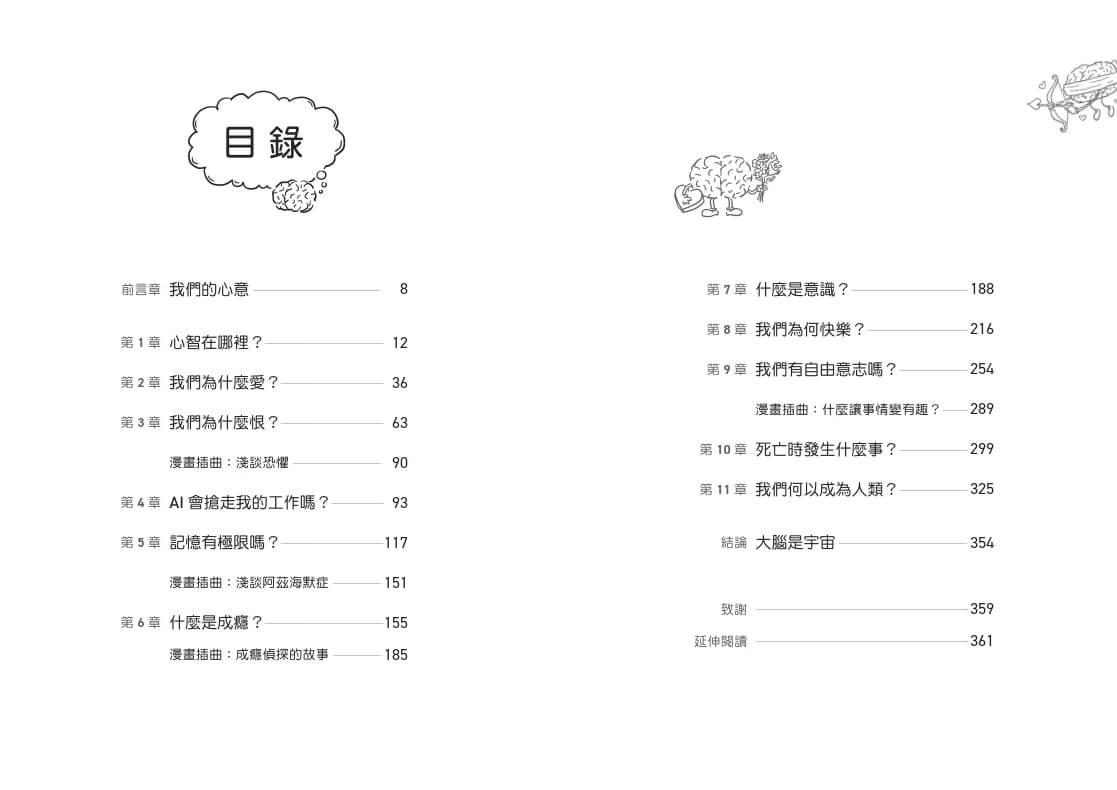 以上種種謎題,在神經科學家與知名漫畫家攜手合作之下,以簡單幽默的文字和圖像揭開謎底。本書以容易理解的圖文方式,從微尺度的神經元如何溝通,講到記憶的形成、不同腦區的功能,以及讓人之所以為人的自由意志是什麼……還有最令人感到好奇的,死亡是怎麼一回事?這些都是人們最常提問的一些大腦相關問題,不僅涉及生物學,也涉及物理、化學、心理、哲學、歷史、醫學等等面向。