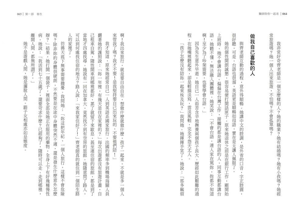 作者站在醫療現場與家庭生活的交會點,面對生活中迎面而來的諸多事情,寫下自己如何成為女兒、媳婦、妻子、母親,也如何一步步成為「會老的那個人」。