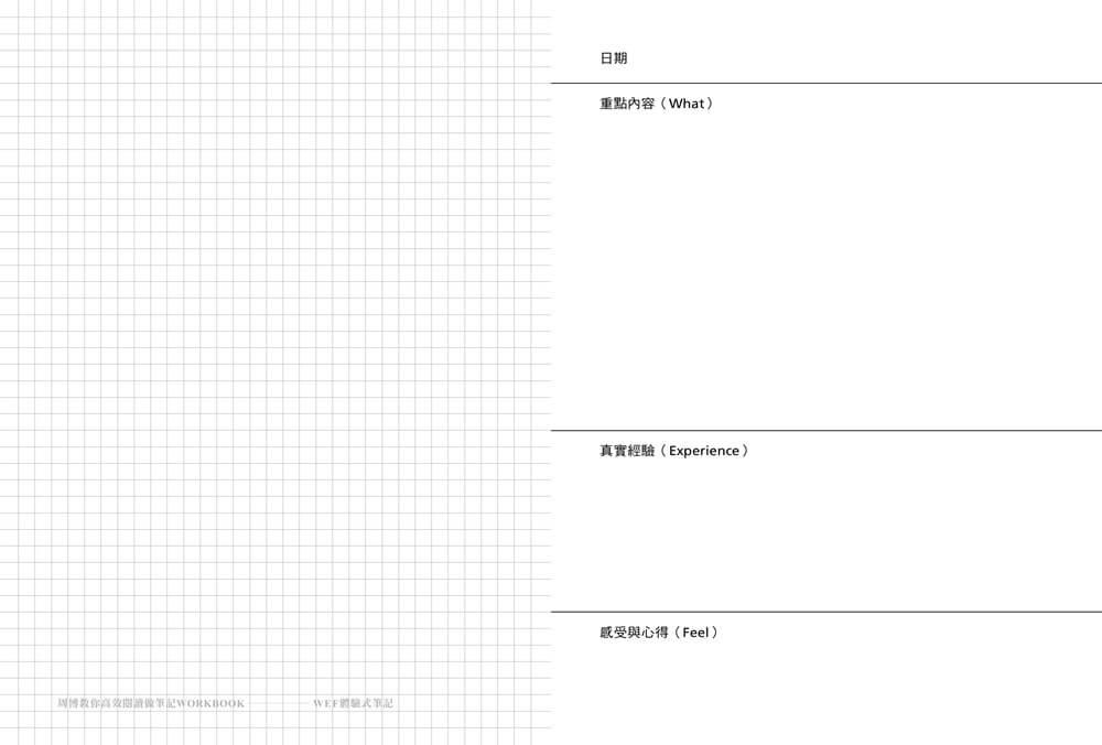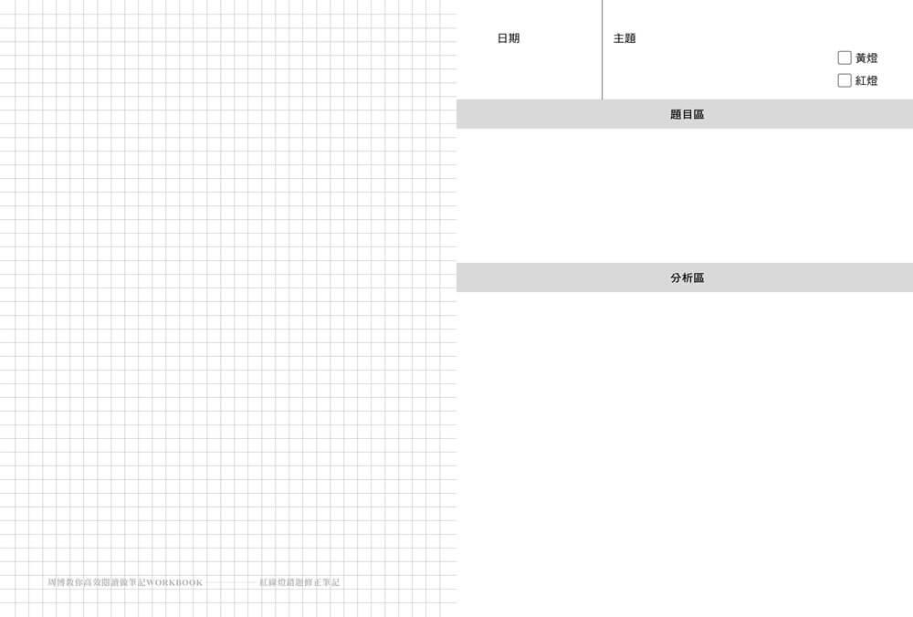 ✓ 要複習時,可以將右邊的「筆記區」遮住,只看左邊「提示區」的問句或是關鍵字,抓出筆記中的重點和內容,藉此深化記憶力。