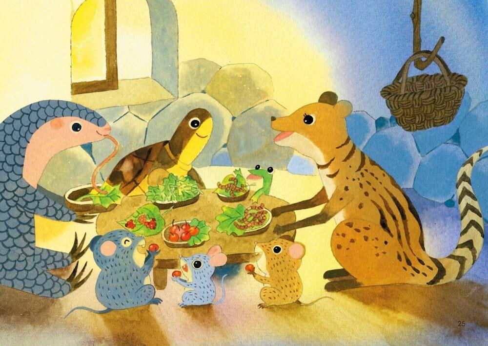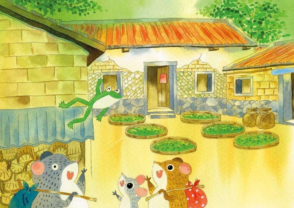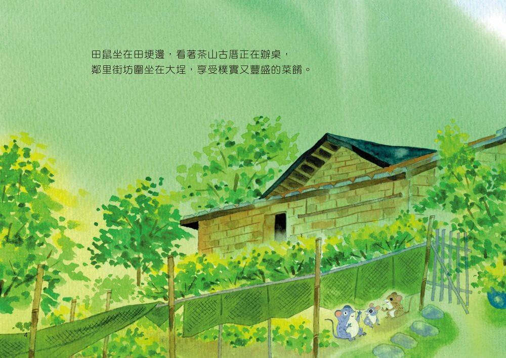 在尋找新家園的過程中,田鼠與樹蛙、穿山甲、毛蟹、麝香貓等動物相遇,牠們有的同行、有的留下,各自依循自己的棲地需求與生活節奏做出選擇。故事隨著四季推移,帶領讀者走過春茶採收、夏日溪流、秋季仙草花開與冬日農閒,逐步展開一幅屬於深坑的田園風景。