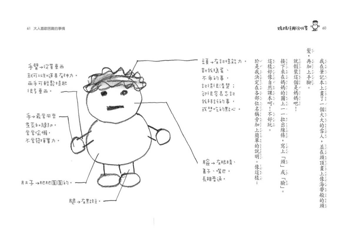 當然,孩子還年幼,過度要求孩子察言觀色、討媽媽歡喜,並不是一個順應孩子發展自我的教育方法。做為與孩子最親近的父母親,還是要能體諒孩子在親密人面前有放鬆、自在、孩子氣、有個性的一面。藉由這本書,讓孩子懂得去觀察、體諒媽媽,養成「同理心」,確實是一種減少親子衝突的好方式喔!如果能夠親子一起共讀這本《媽媽使用說明書》,共同發想一套「媽媽跟孩子都適合的說明書」,那就更棒啦!