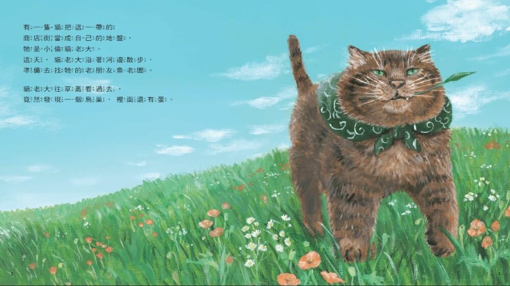 這天,貓老大沿著河邊散步,準備去找牠的老朋友魚老闆。