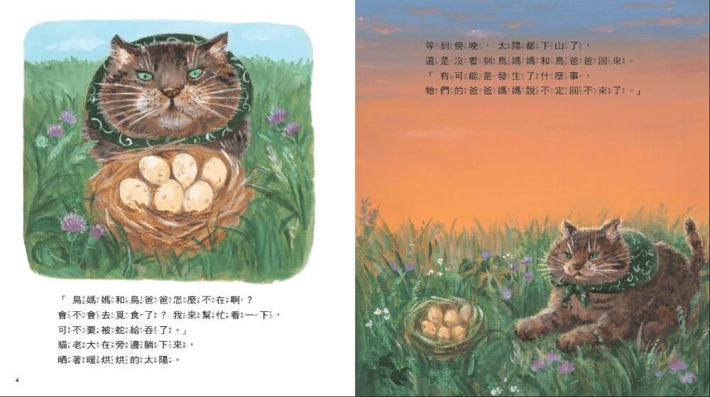 貓老大把那六顆蛋包進包巾,背在背上,一步一步的往前走。