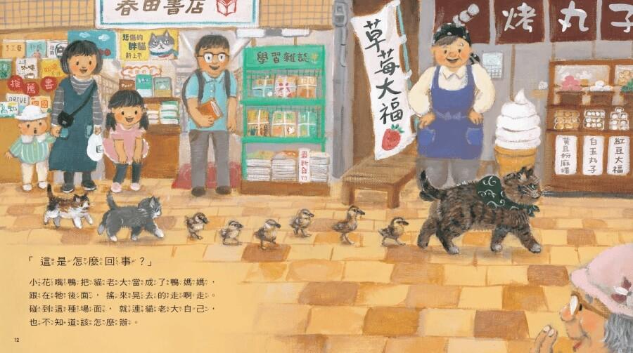 貓老大抽動鼻子,用力吸啊吸。當牠走到商店街的時候,「嘰嘰」「嘰嘰嘰」背上傳出吵鬧聲。