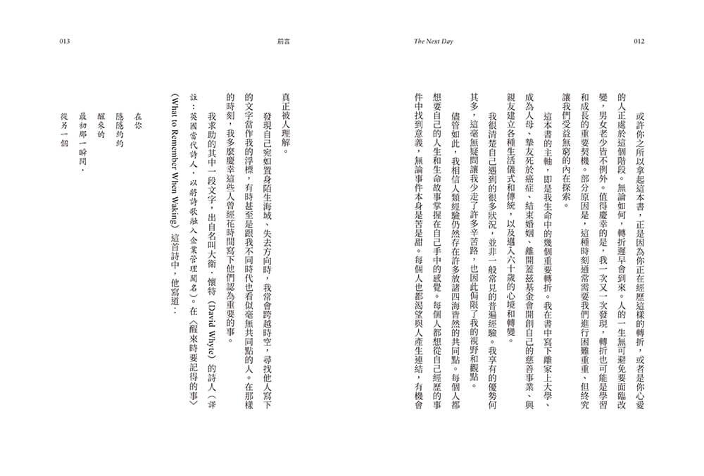 邁向六十歲生日之際,我決定在自己面前的空白頁上,填滿幫助我度過人生重大轉折、成就今日的我的許多人與理念,以表達我的敬意。希望其他人也能從中獲得幫助。下次當你面對未知的挑戰時,希望你能翻開這本書的任何一章,覺得在難以預料的世事變遷中多一點放心、對自己適應變化和持續進步的能力多一點信心,也更加確信,第二天可能就是開啟無限可能的起點。