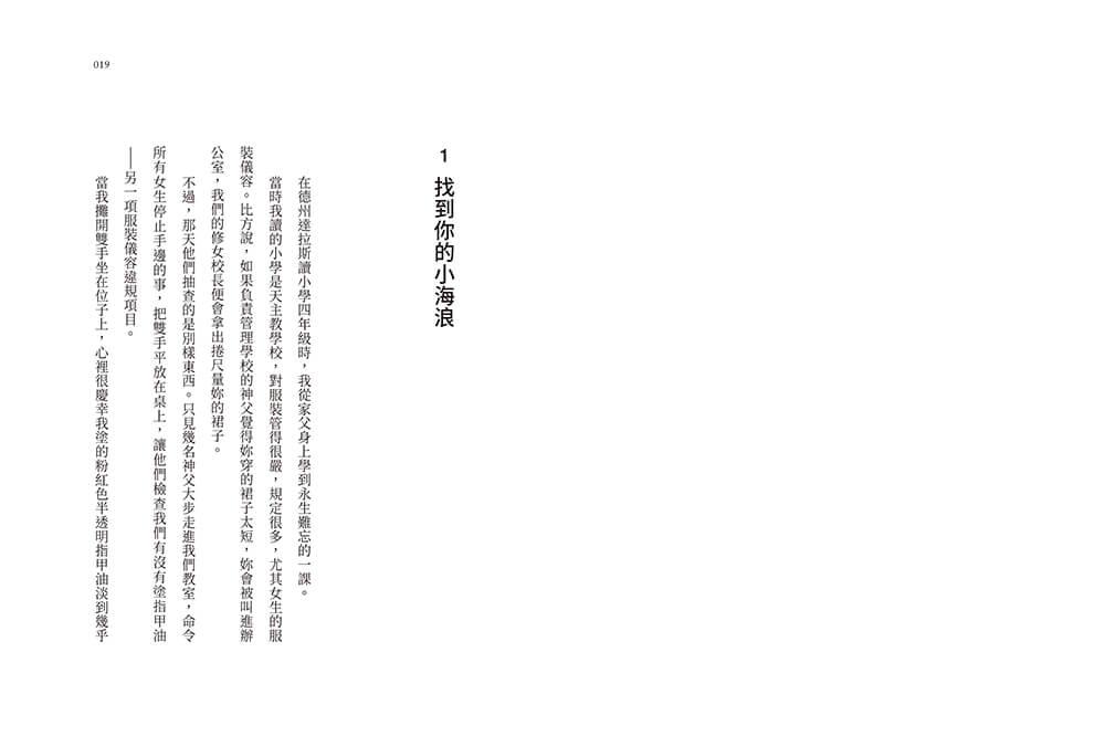 我不太記得那一天我為什麼剛好塗了指甲油,但我猜應該是為了上教堂比較好看(在達拉斯,上教堂確實是要盛裝打扮的場合),想想還真是諷刺。無論是什麼原因,我很確定塗指甲油的時候,我從沒想過自己這麼做違反了校規。那並非明知故犯的叛逆舉動。再說,我的指甲油顏色很淡很淡,就算神父把全班同學的指甲都巡一輪,我也很確定他不會注意到。