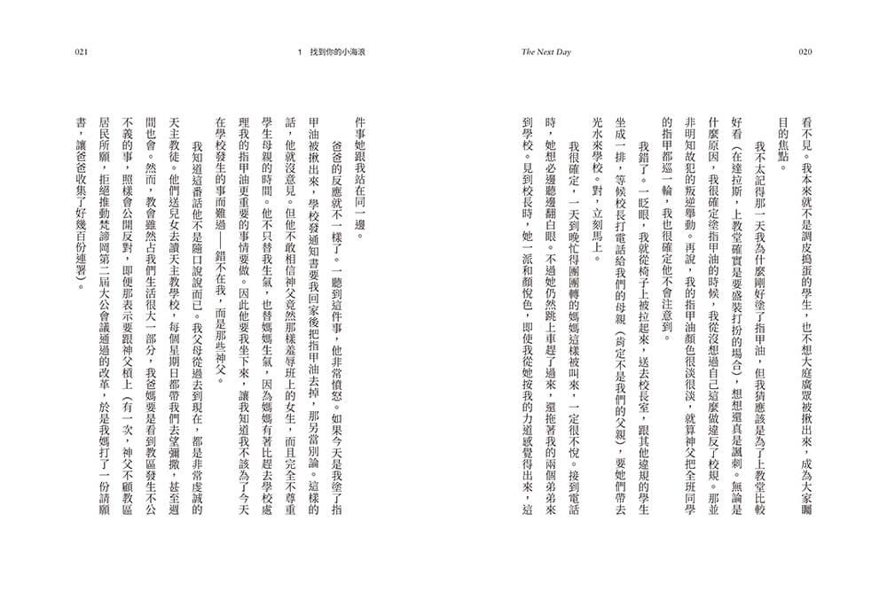 不過,那天他們抽查的是別樣東西。只見幾名神父大步走進我們教室,命令所有女生停止手邊的事,把雙手平放在桌上,讓他們檢查我們有沒有塗指甲油——另一項服裝儀容違規項目。
