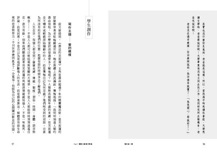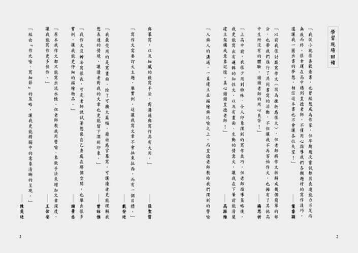 「種種寫作策略對我影響最大的是意象與比喻,使我作文內容豐富、有層次,亦不再受字數不足之苦。」——吳羿葆