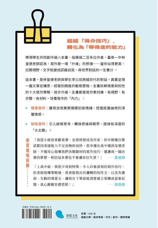 這不僅是一本工具書,更是林皇德老師與學生李沁玹跨越世代的對話,真實呈現一篇文章從構思到精進的動態歷程。全書都是寫作素材庫,有視野、有步驟、有材料,培養寫作的「內力」,逐步升維。本書將拆解情意與知性的十大寫作策略: