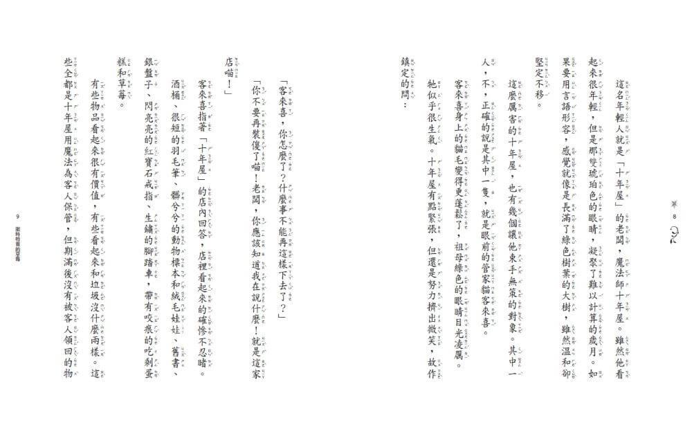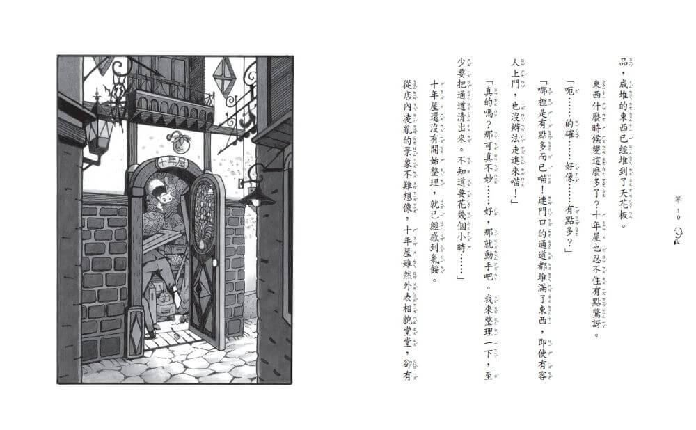 「你這句話只說對了一半,另一半不太正確。」年輕人面帶微笑的回答,「沒錯,我是會使用十年魔法的魔法師,大家都叫我『十年屋』,但是,並不是我帶你來這家店,而是你需要這家店,所以開啟了通往這家店的通道。」
